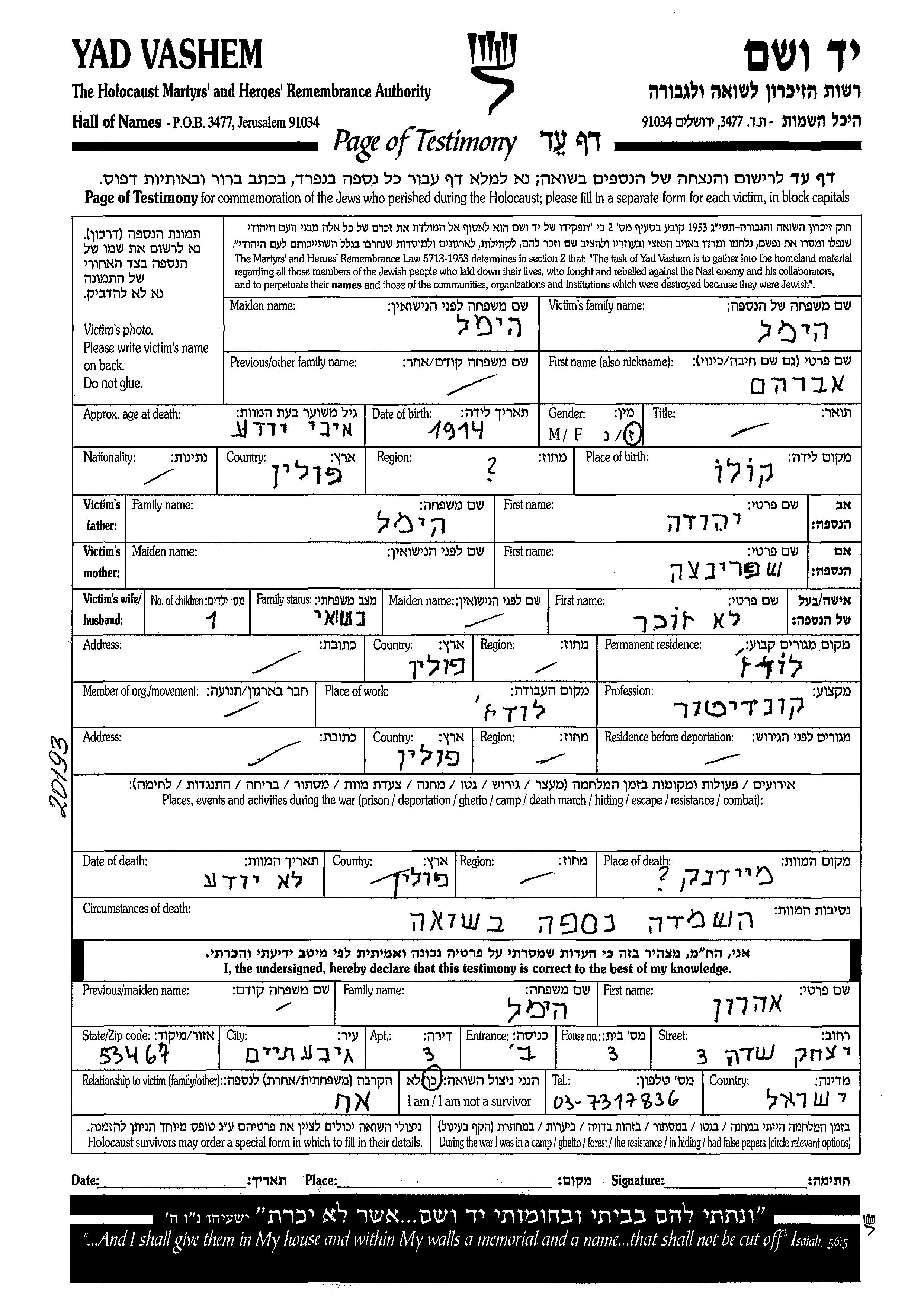 Himel Avraham 1914 Lodz, Pologne Feuille de témoignage