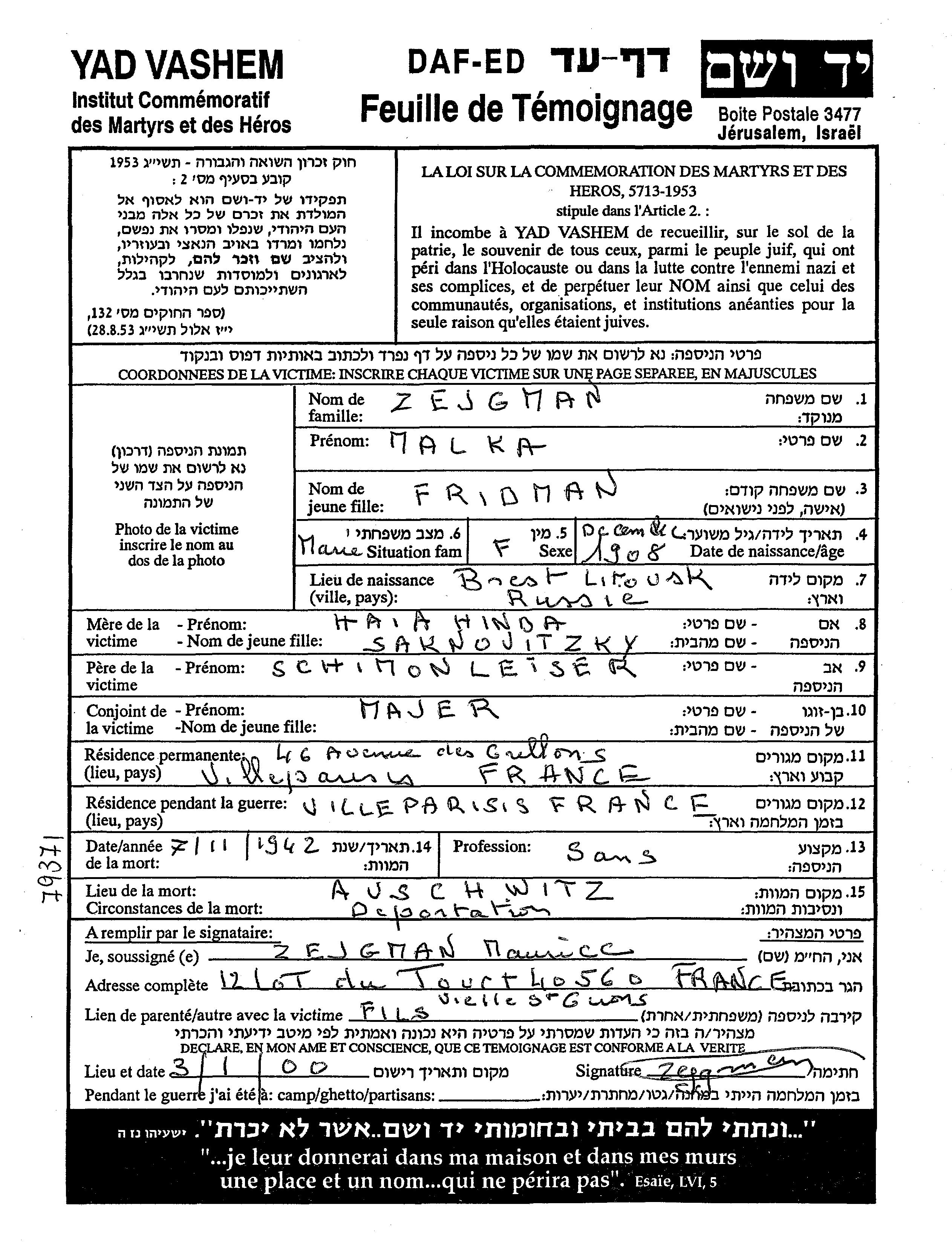 Zejgman Malka 1908 Villeparisis, France Feuille de témoignage