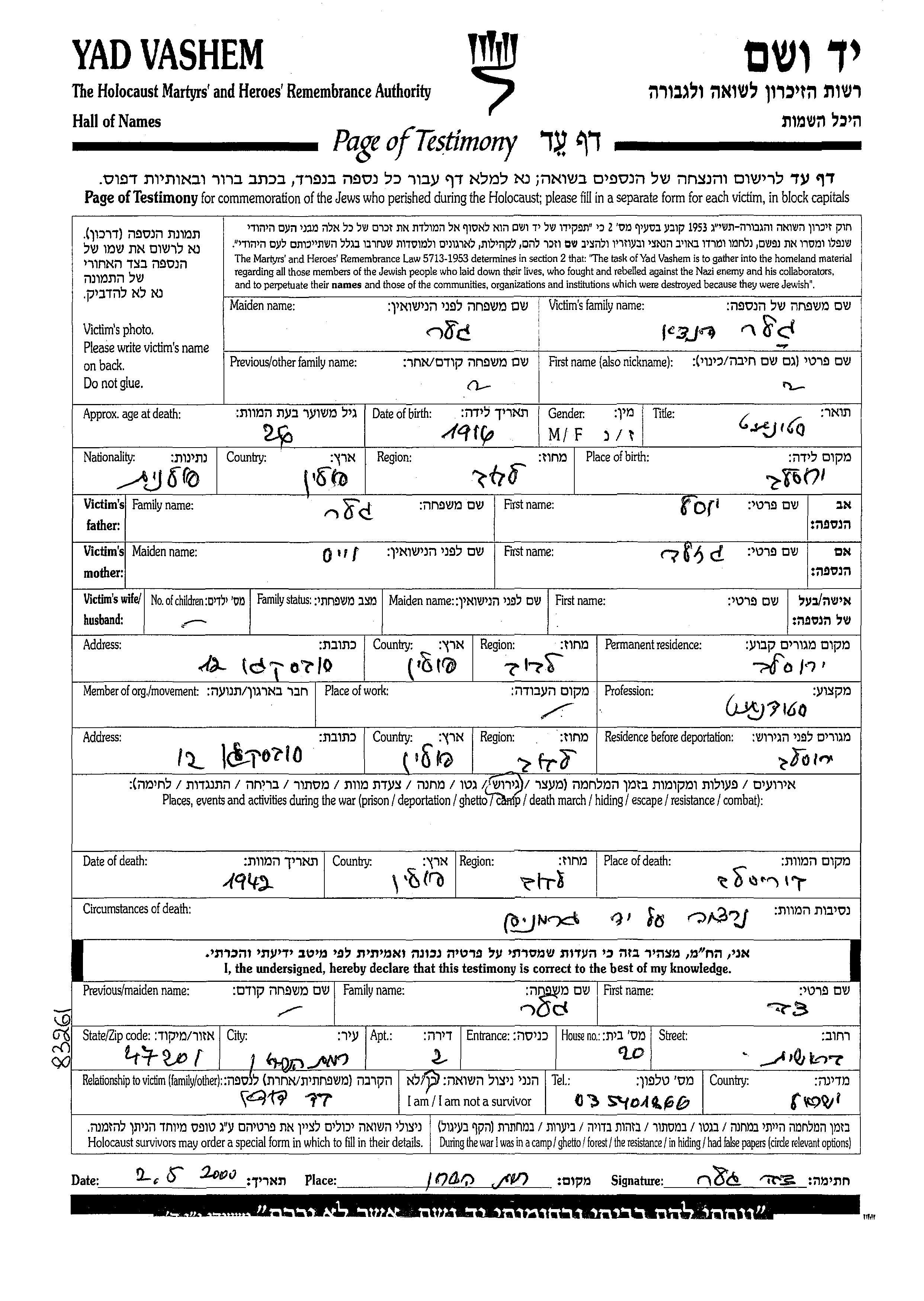 Yad Vashem - Pages of Testimony Names Memorial Collection