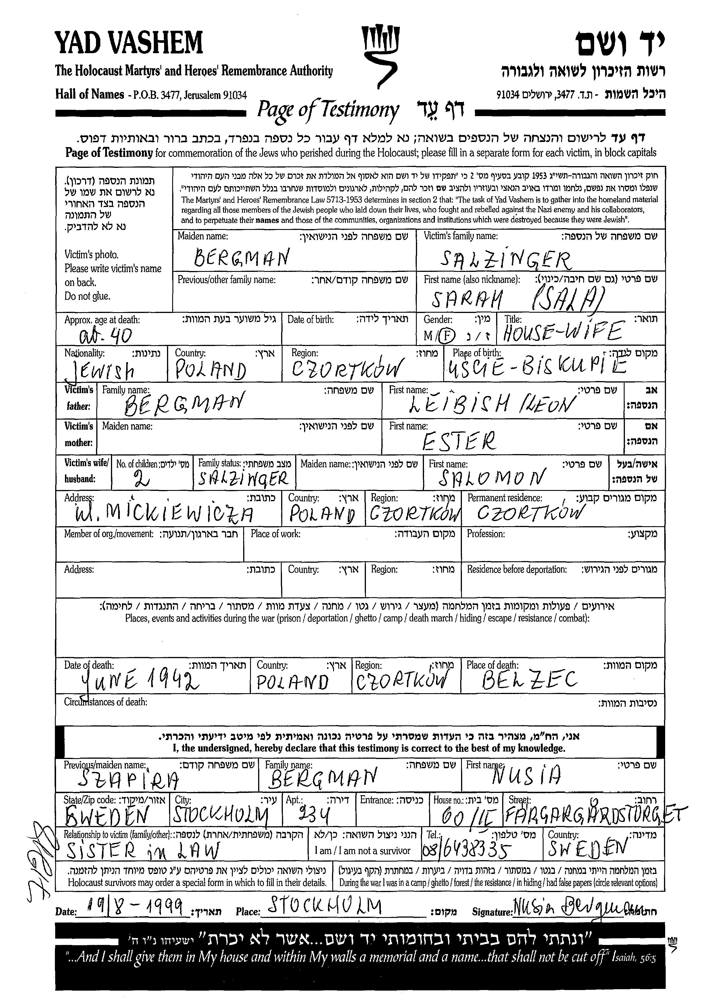 Sarah Sala Salzinger née Bergman est née à Uscie Biskupie, Pologne, fille de Leibish Leon et de Ester. Elle était Femme au foyer. Avant la seconde guerre mondiale elle vivait à Czortkow, Pologne.