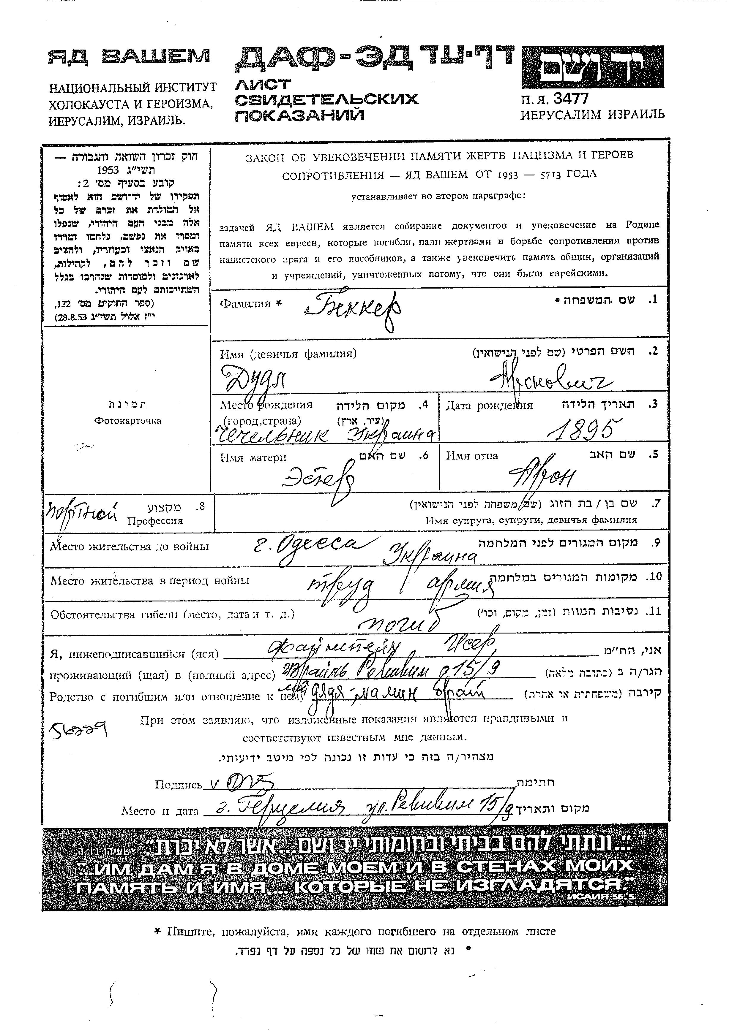 Dudl Bekker est né à Chechelnik, Ukraine (URSS) en 1895, fils de Aron et de Ester. Il était Tailleur. Avant la seconde guerre mondiale il vivait à Odessa, Ukraine (URSS). Au cours de la guerre, il était à the Soviet armed forces.
