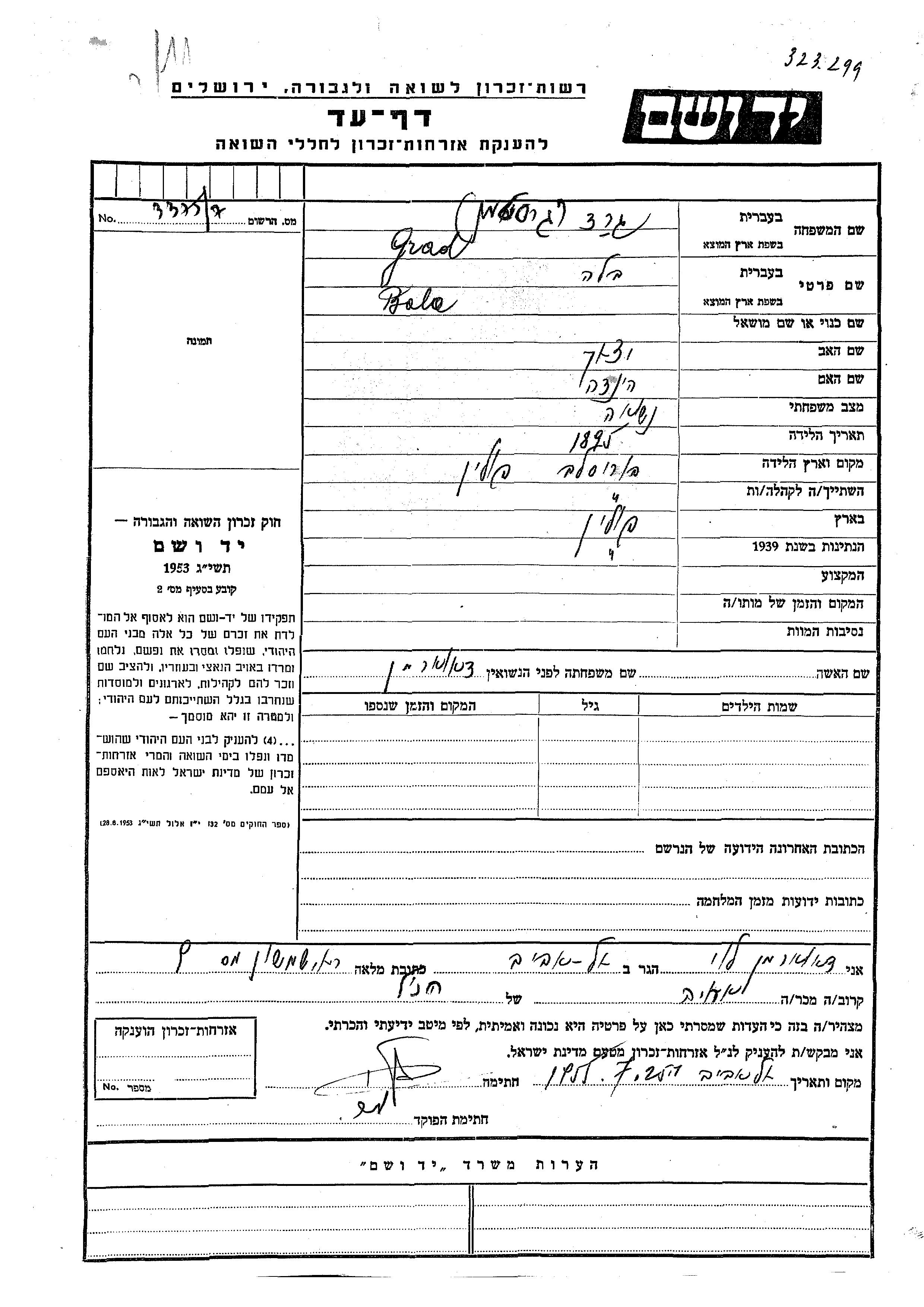 Grad Gerstman Bela 1895 Borislav, Pologne Feuille de témoignage