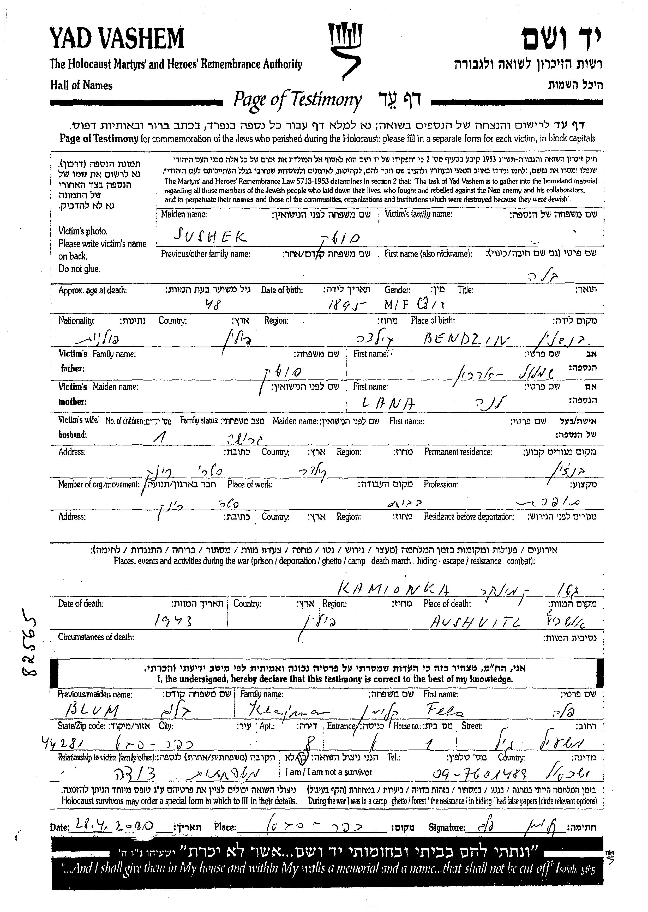 Bela nom inconnu née Sushek est née à Bendzin, Pologne en 1895, fille de Shmuel Aharon et de Lana. Elle était Couturière et Divorcée. Avant la seconde guerre mondiale elle vivait à Bendzin, Pologne. Pendant la guerre, elle était à Kamionka, Pologne.