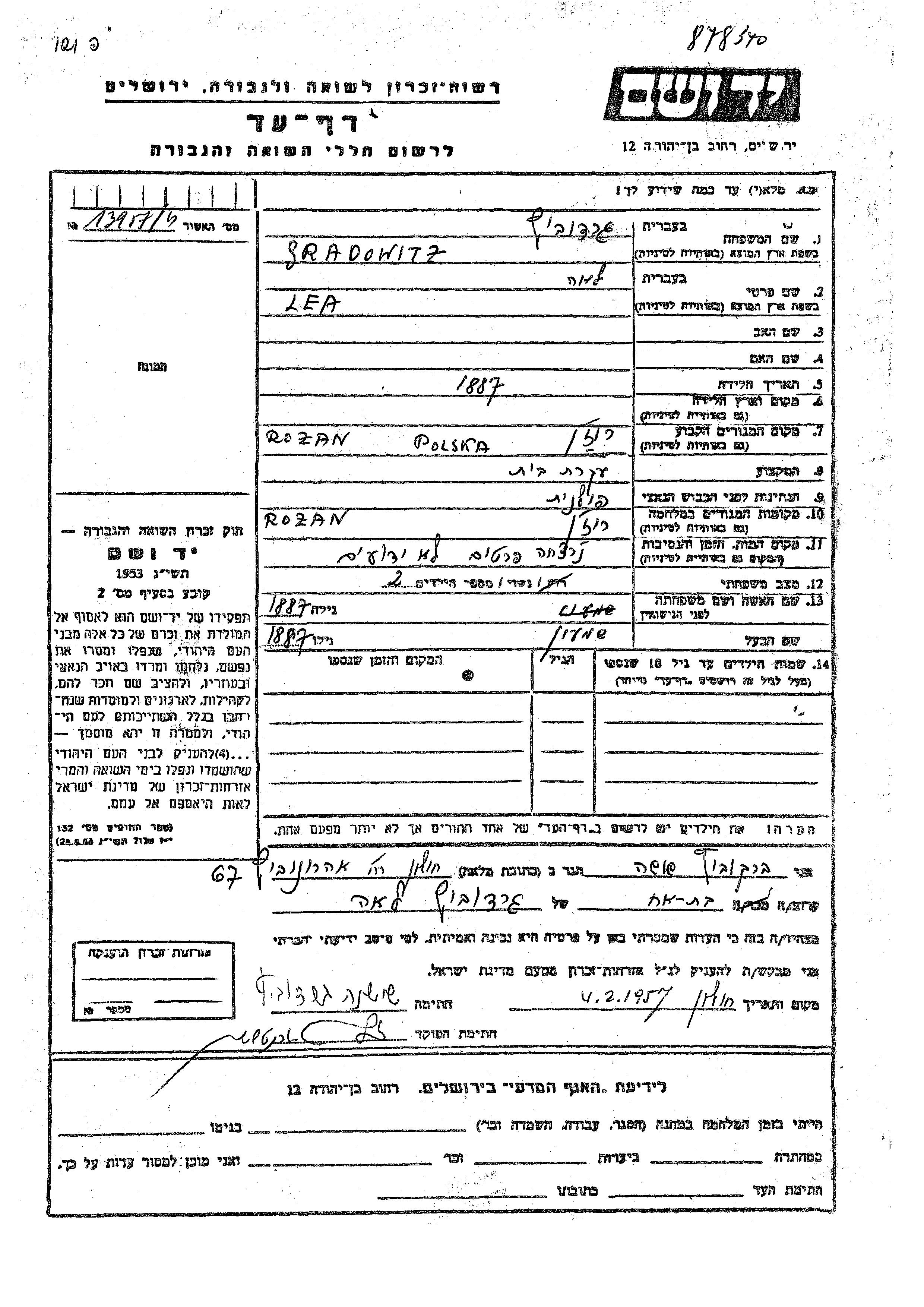 Lea Gradowitz est née en 1887. Elle était Femme au foyer et Mariée à Shimon. Avant la seconde guerre mondiale elle vivait à Rozan, Pologne. Pendant la guerre, elle était à Rozan, Pologne.
