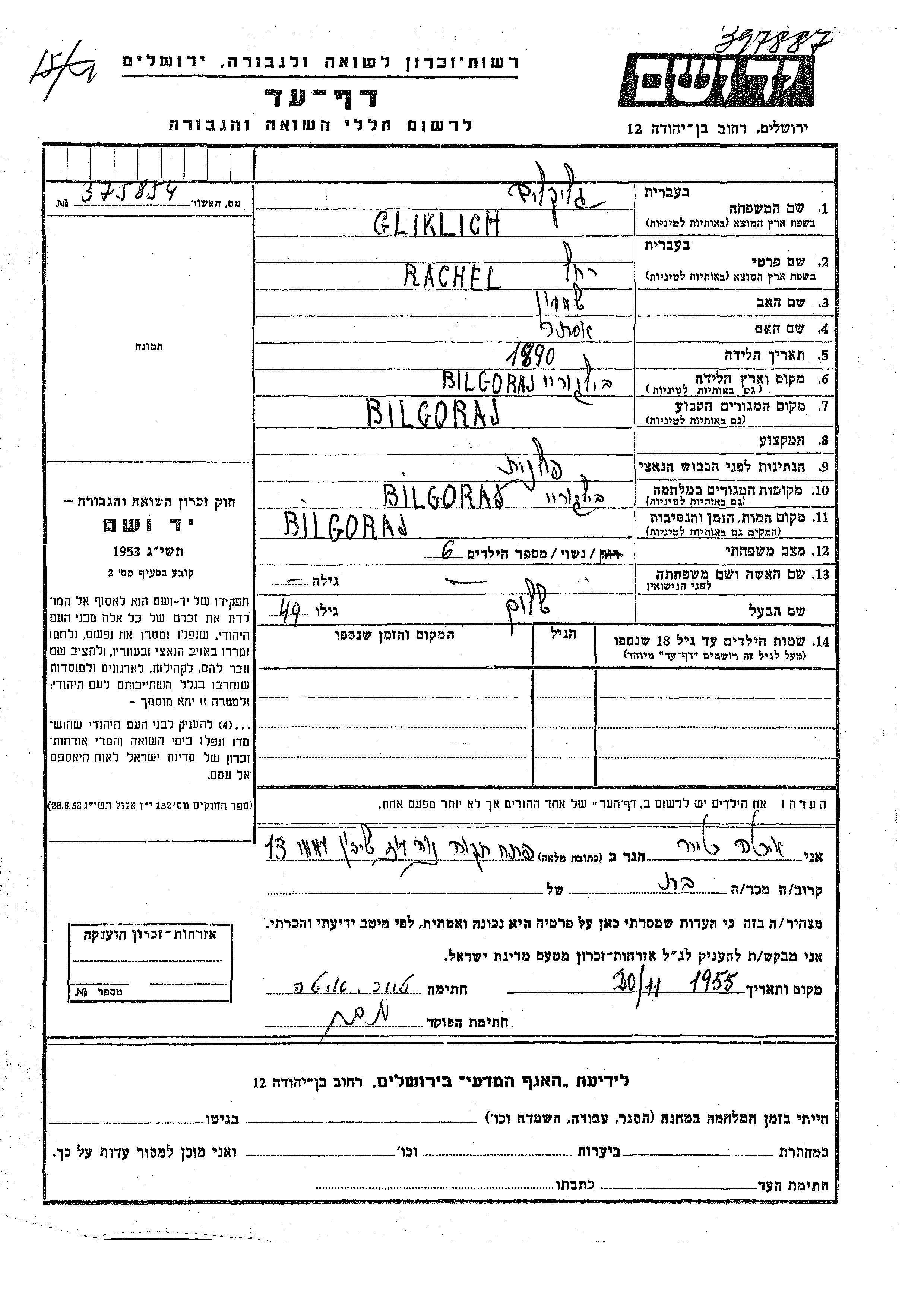 Rachel Gliklich est née en 1890, fille de Shimon et de Ester. Elle était Mariée à Shalom.