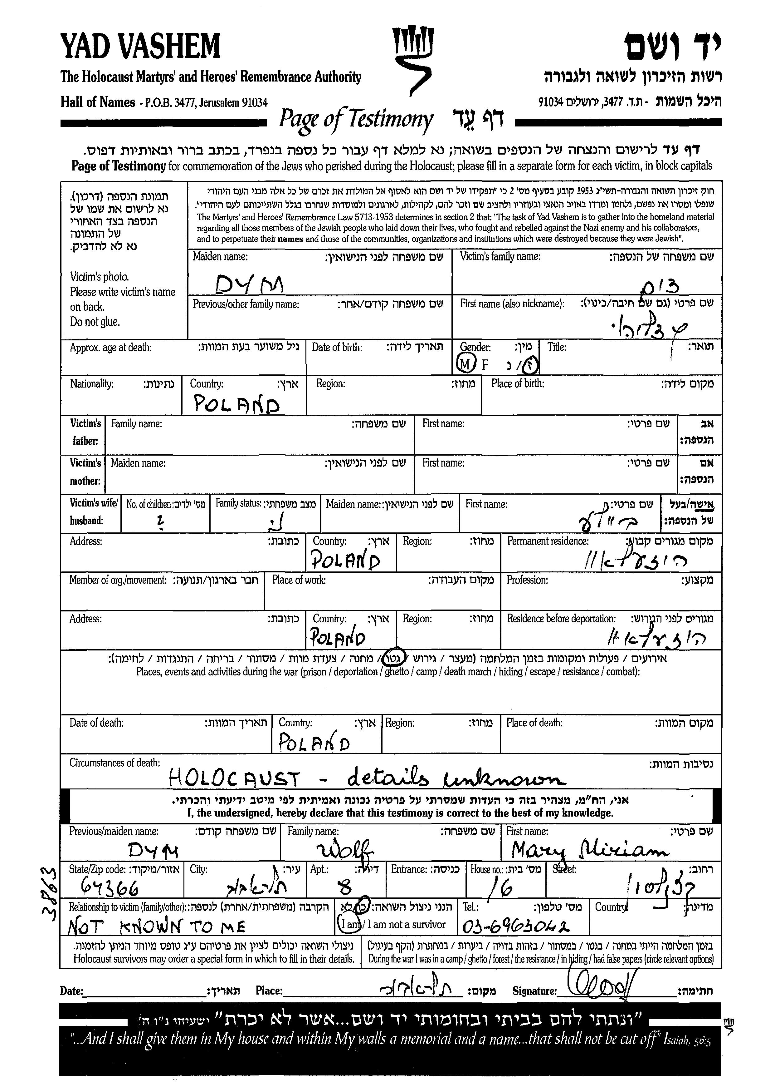 Dym Gdaliyahu Chorzelow, Pologne Feuille de témoignage