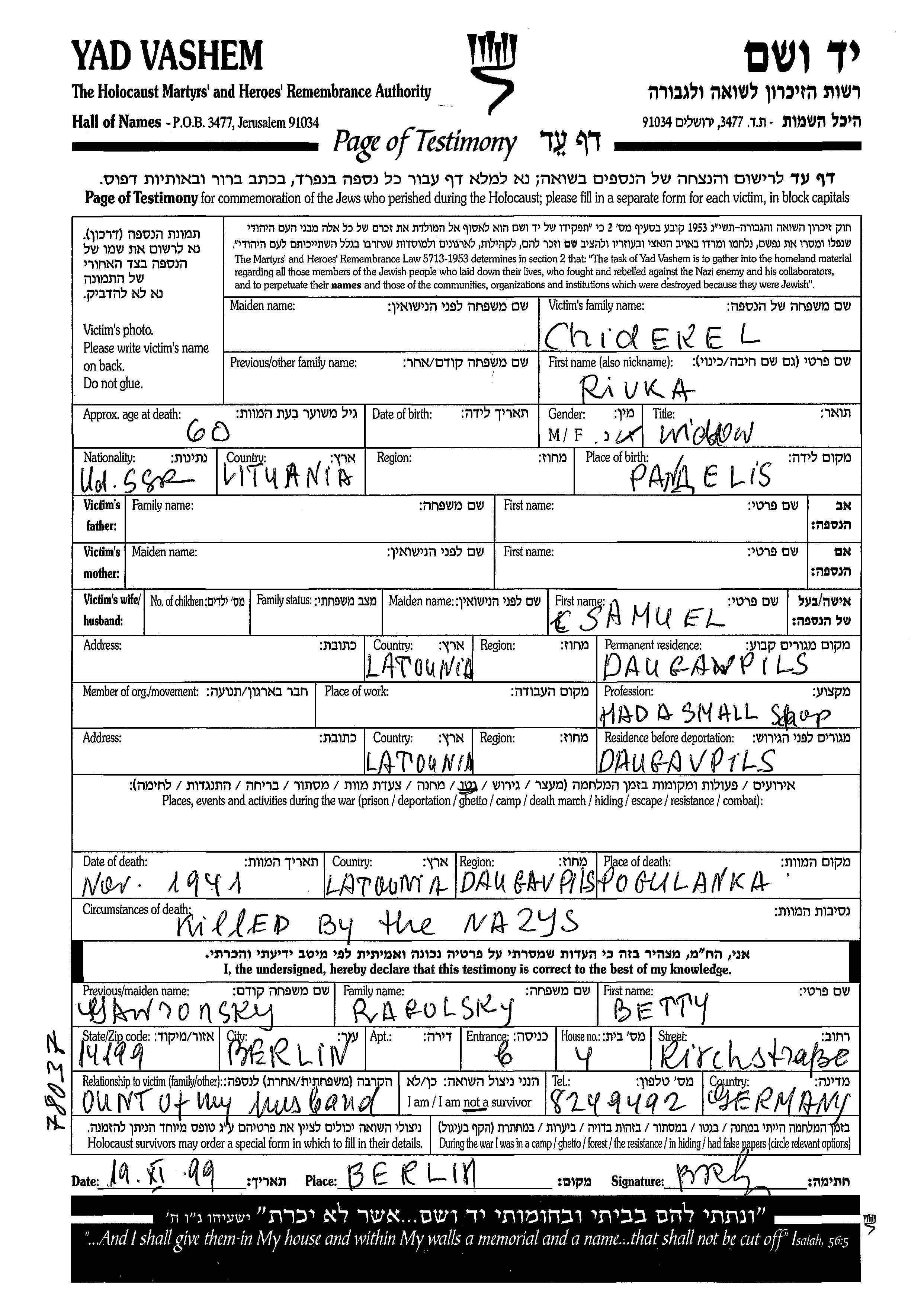 Yad Vashem - Pages of Testimony Names Memorial Collection