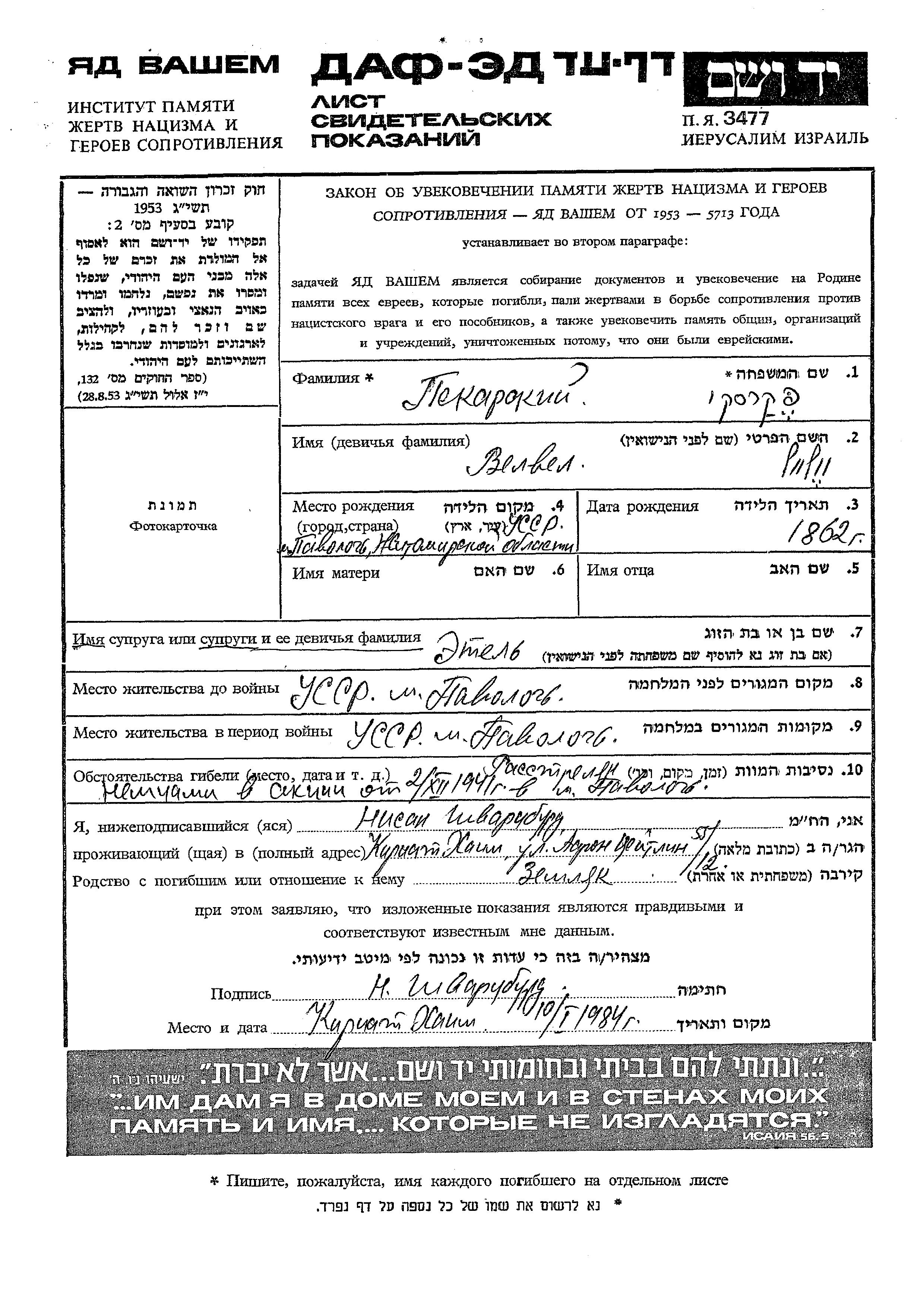 Pekarski Velvel 1862 Pavoloch, Ukraine (URSS) Feuille de témoignage