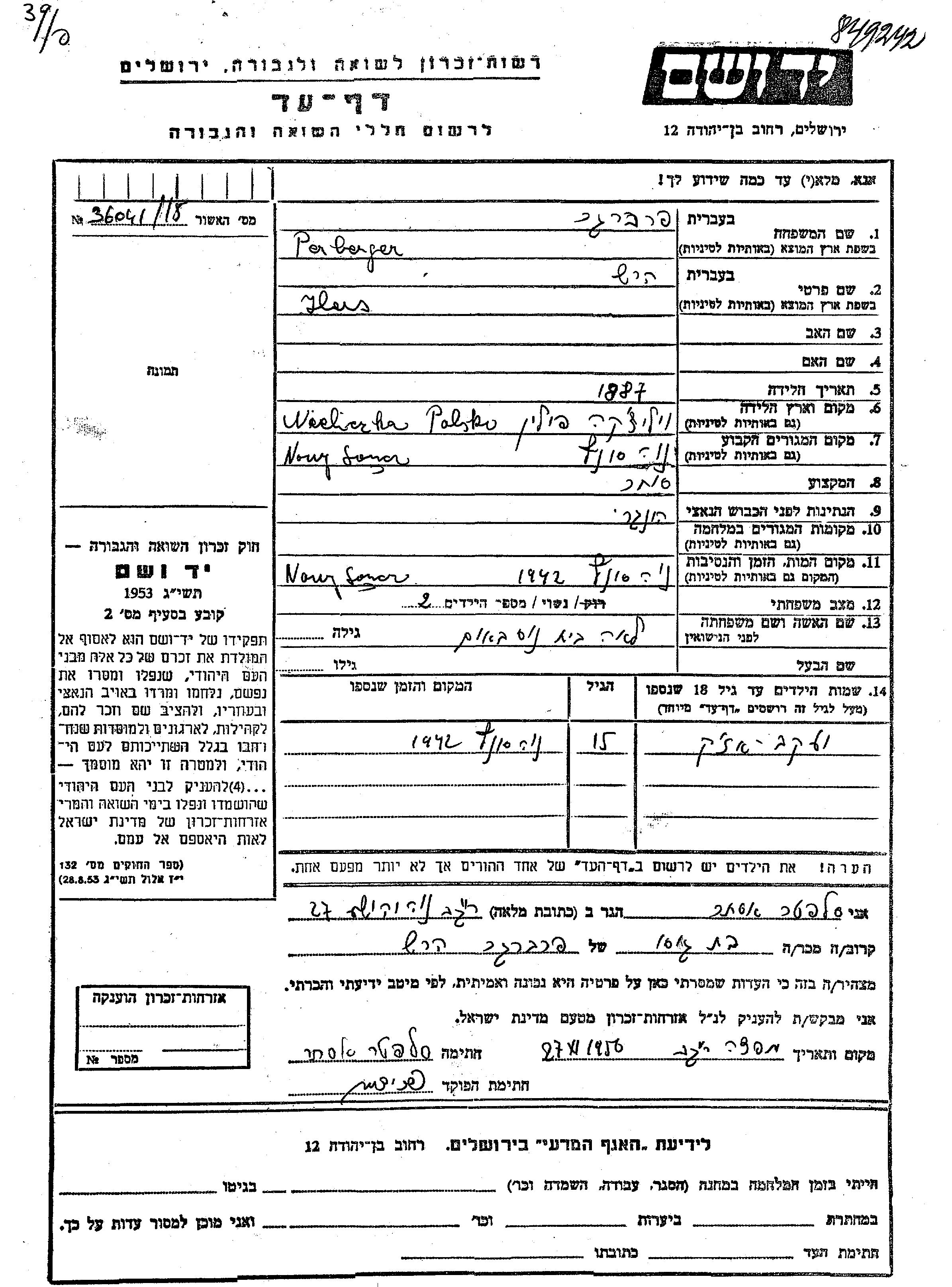 Hers Perberger est né à Wieliczka, Pologne en 1887. Il était Commerçant/e et Mariée à Lea née Nusbaum. Avant la seconde guerre mondiale il vivait à Nowy Sącz, Pologne.