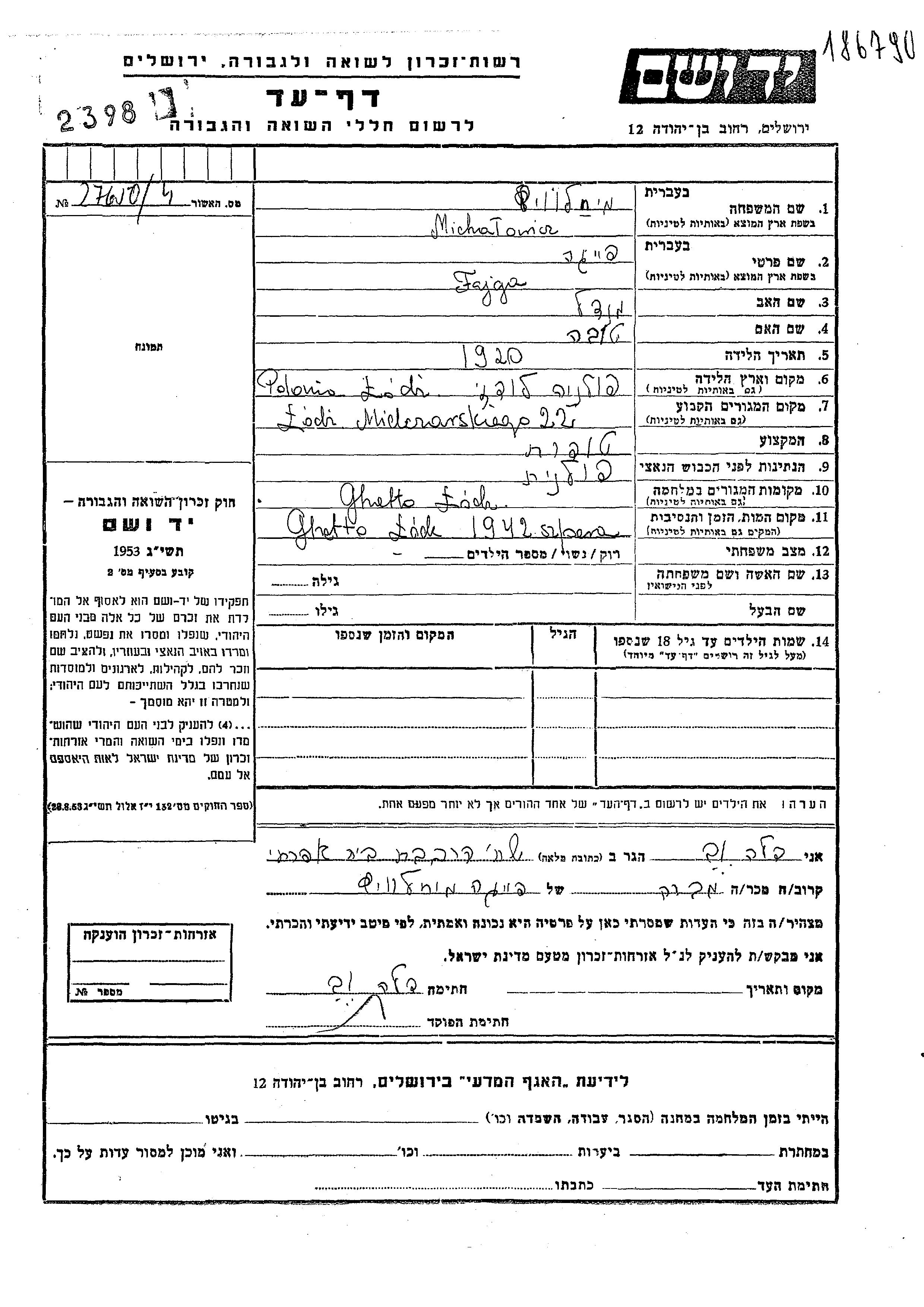 Michalowicz Fajga 1920 Lodz, Pologne Feuille de témoignage