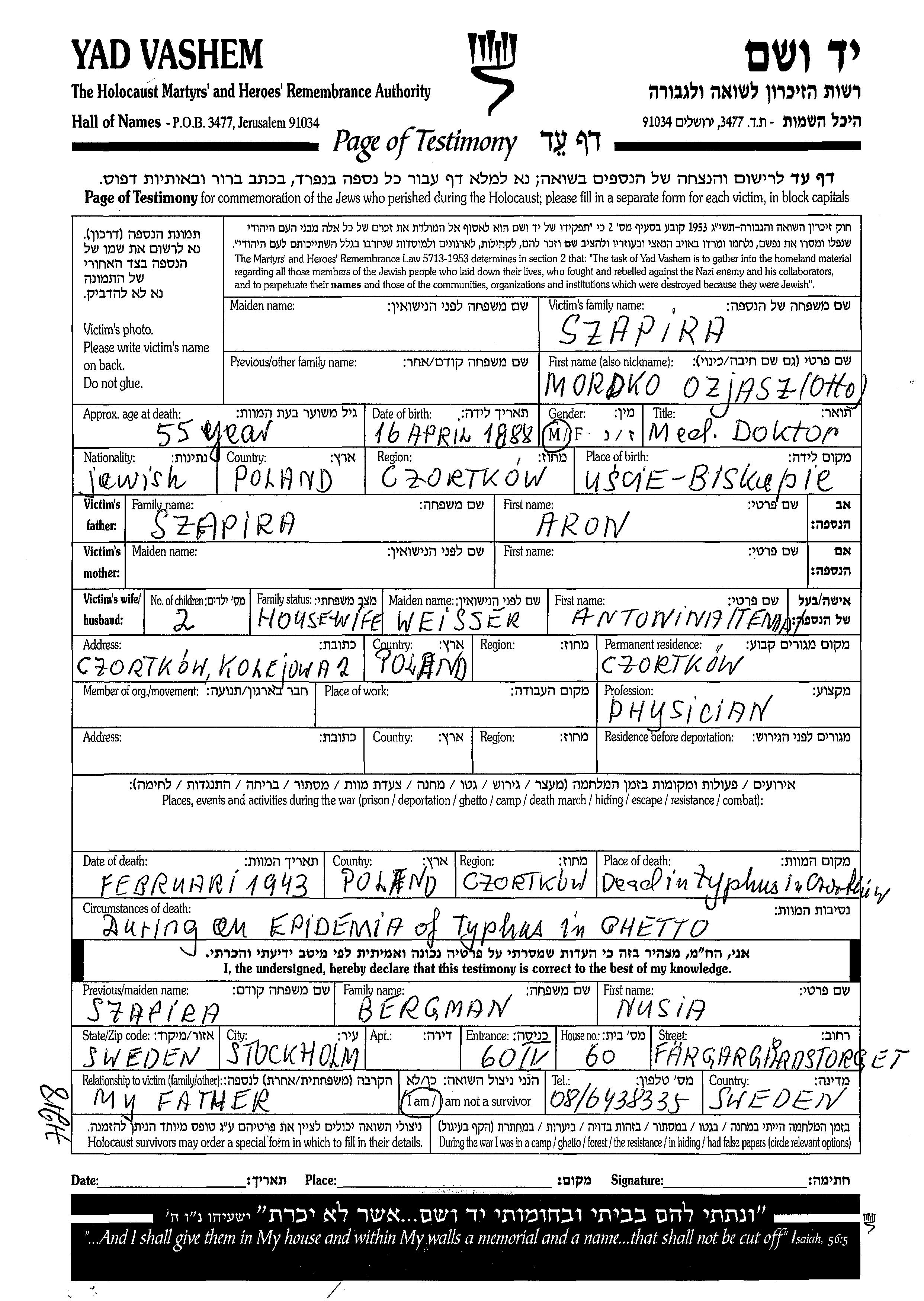 Docteur Mordko Ozjasz Otto Szapira est né à Uscie Biskupie, Pologne en 1888, fils de Aron. Il était Médecin et Mariée à Antonina Tema née Weisser. Avant la seconde guerre mondiale il vivait à Czortkow, Pologne.