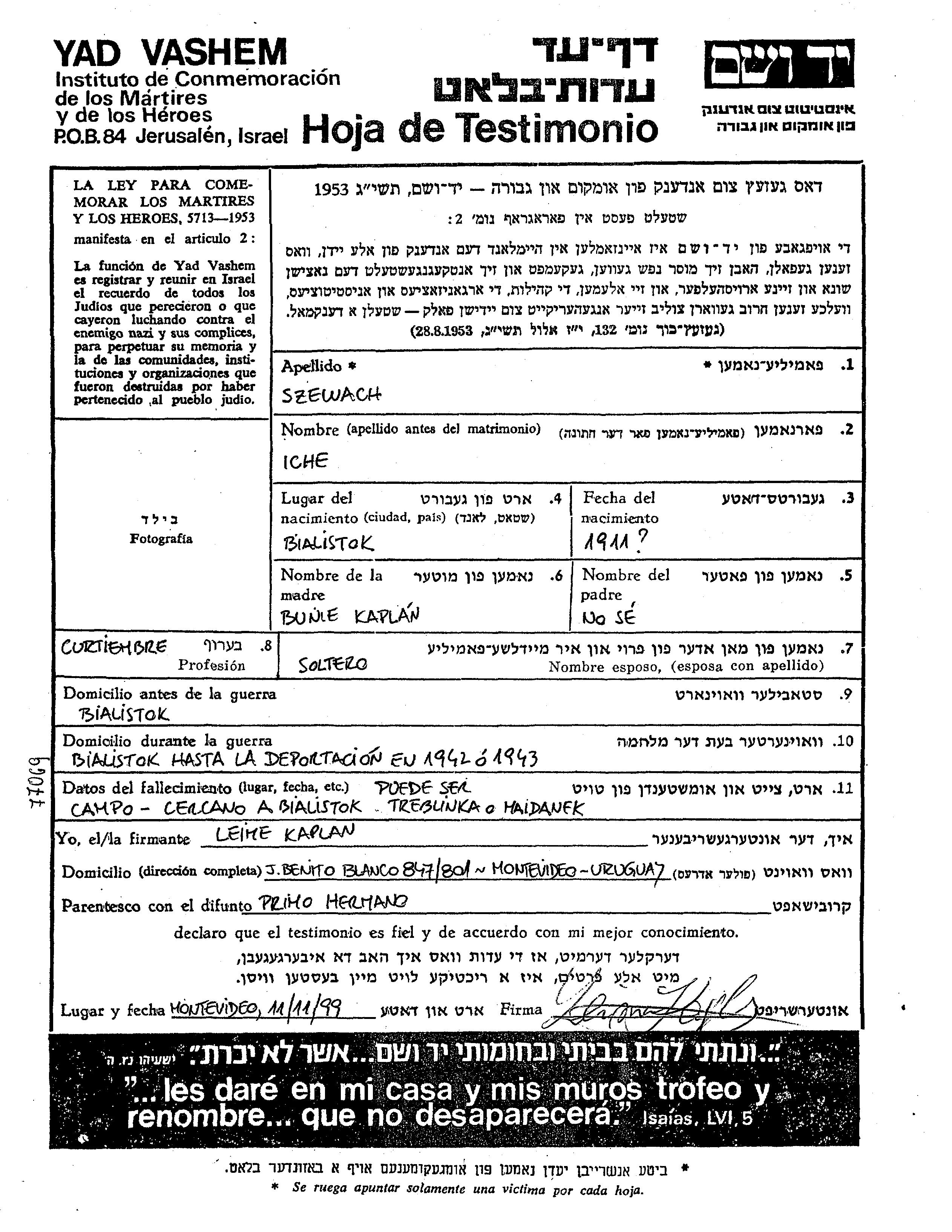 Szewach Iche 1911 Bialystok, Pologne Feuille de témoignage