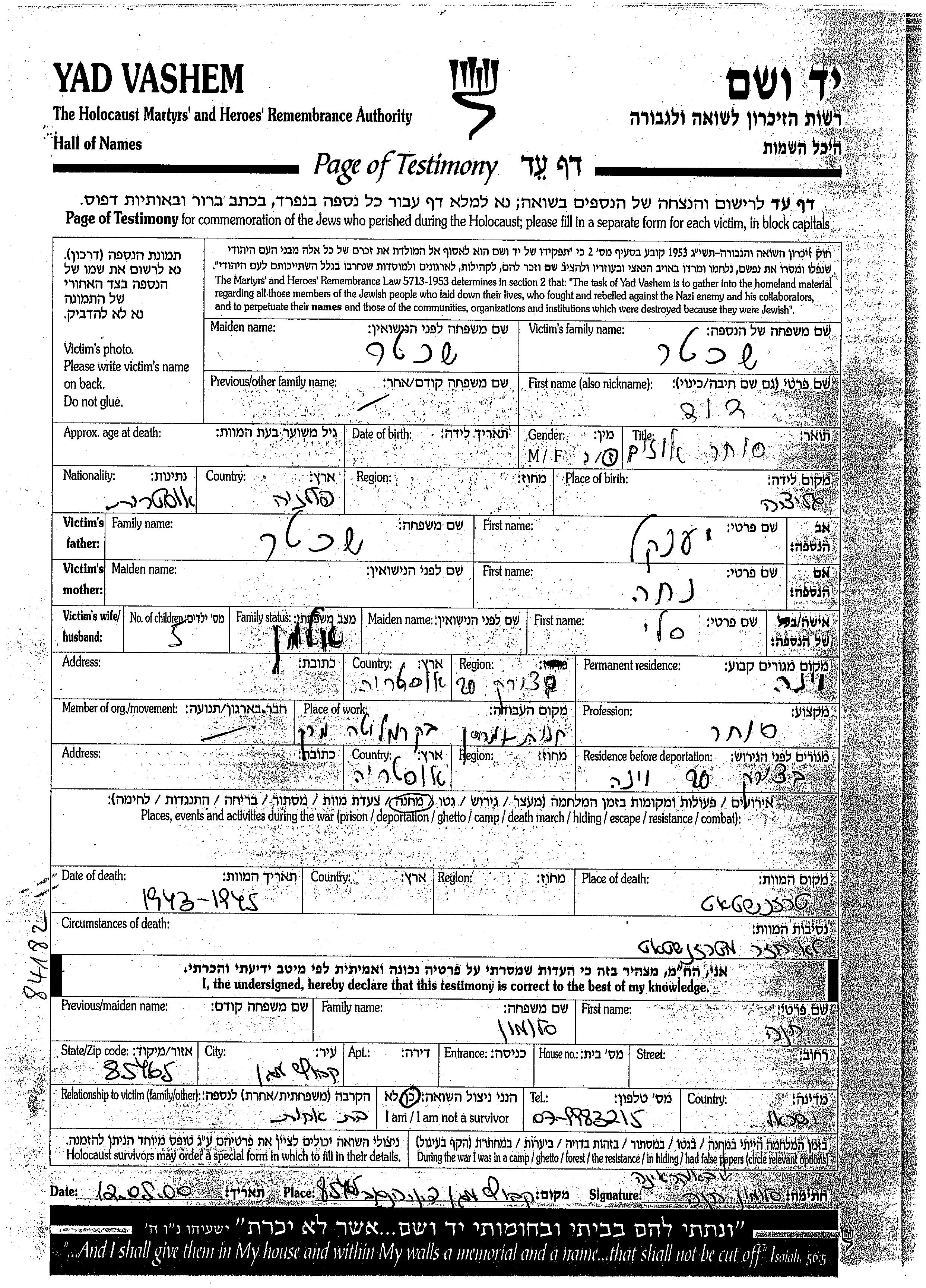 Yad Vashem - Pages of Testimony Names Memorial Collection