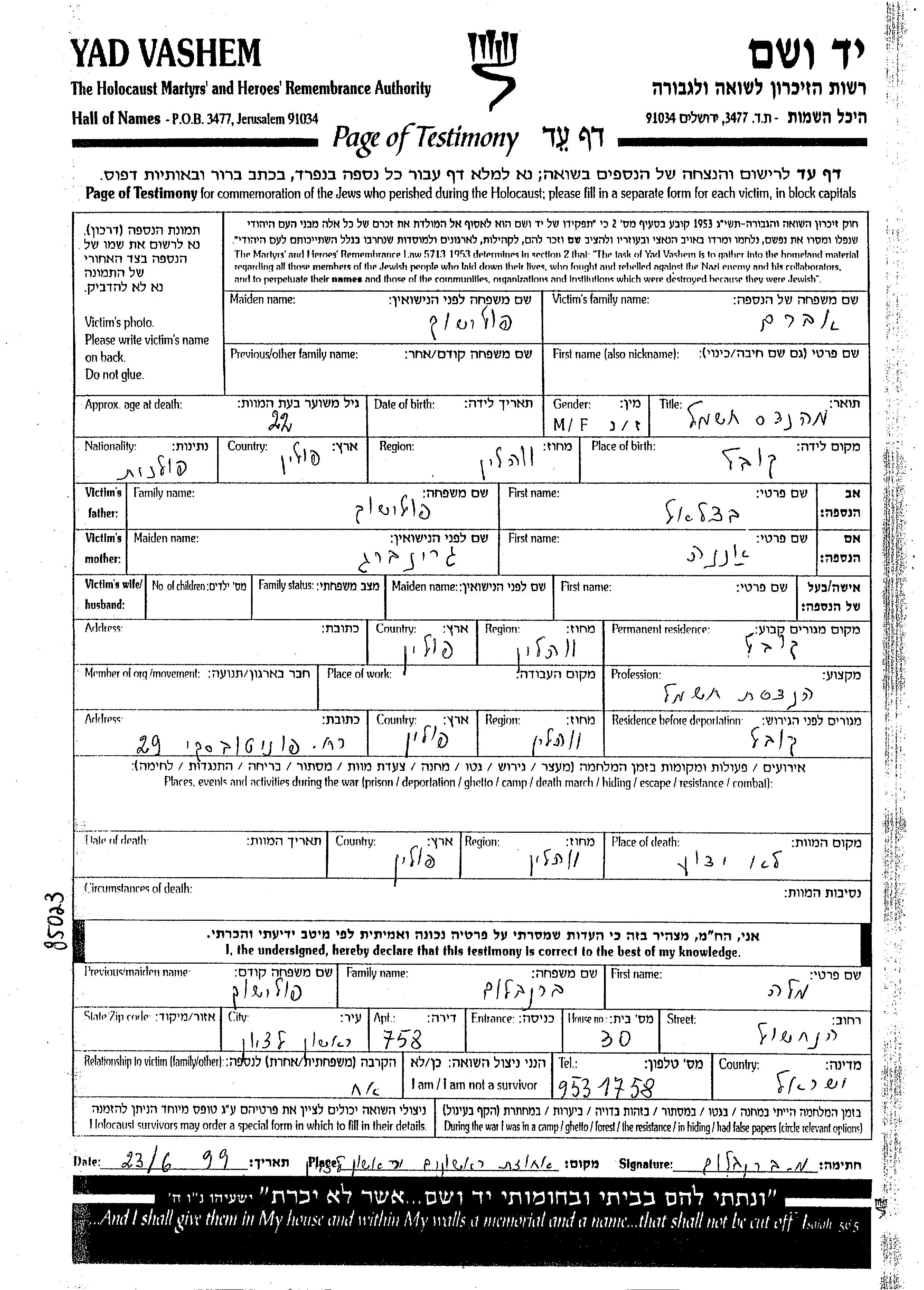Yad Vashem - Pages of Testimony Names Memorial Collection