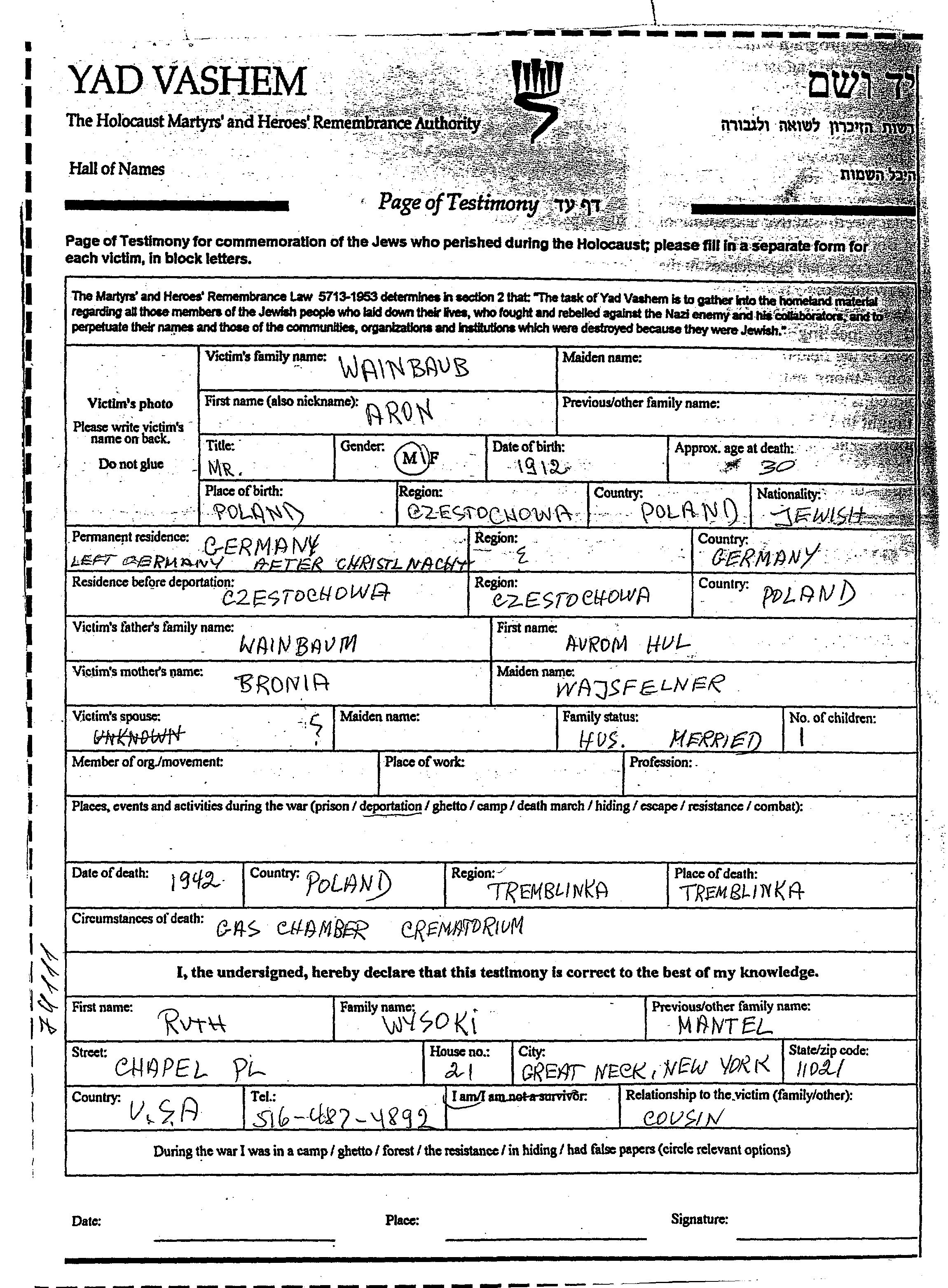 Aron Wainbaum est né à Czestochowa, Pologne en 1912, fils de Avrom Hol Hul et de Bronia. Il était Marié. Avant la seconde guerre mondiale il vivait à Allemagne. Au cours de la guerre, il était à Czestochowa, Pologne.