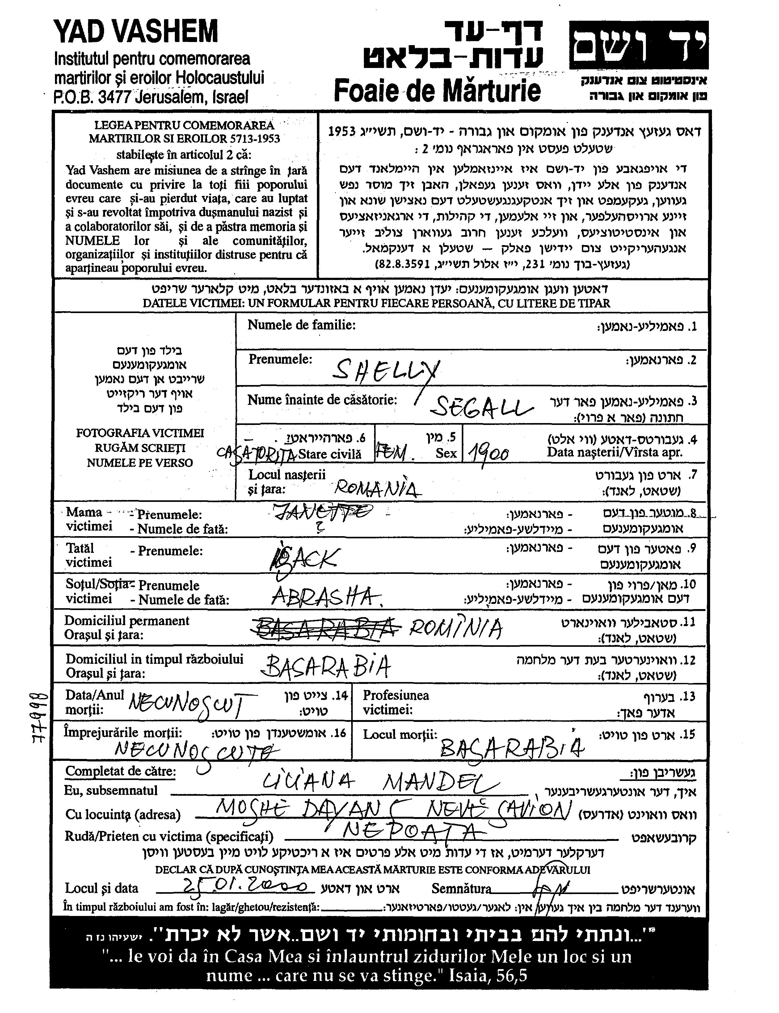 Shelly nom inconnu née Segall est née à Roumanie en 1900, fille de Isack et de Janette. Elle était Mariée à Abrasha. Avant la seconde guerre mondiale elle vivait à Roumanie. Pendant la guerre, elle était à Bessarabia, Roumanie.