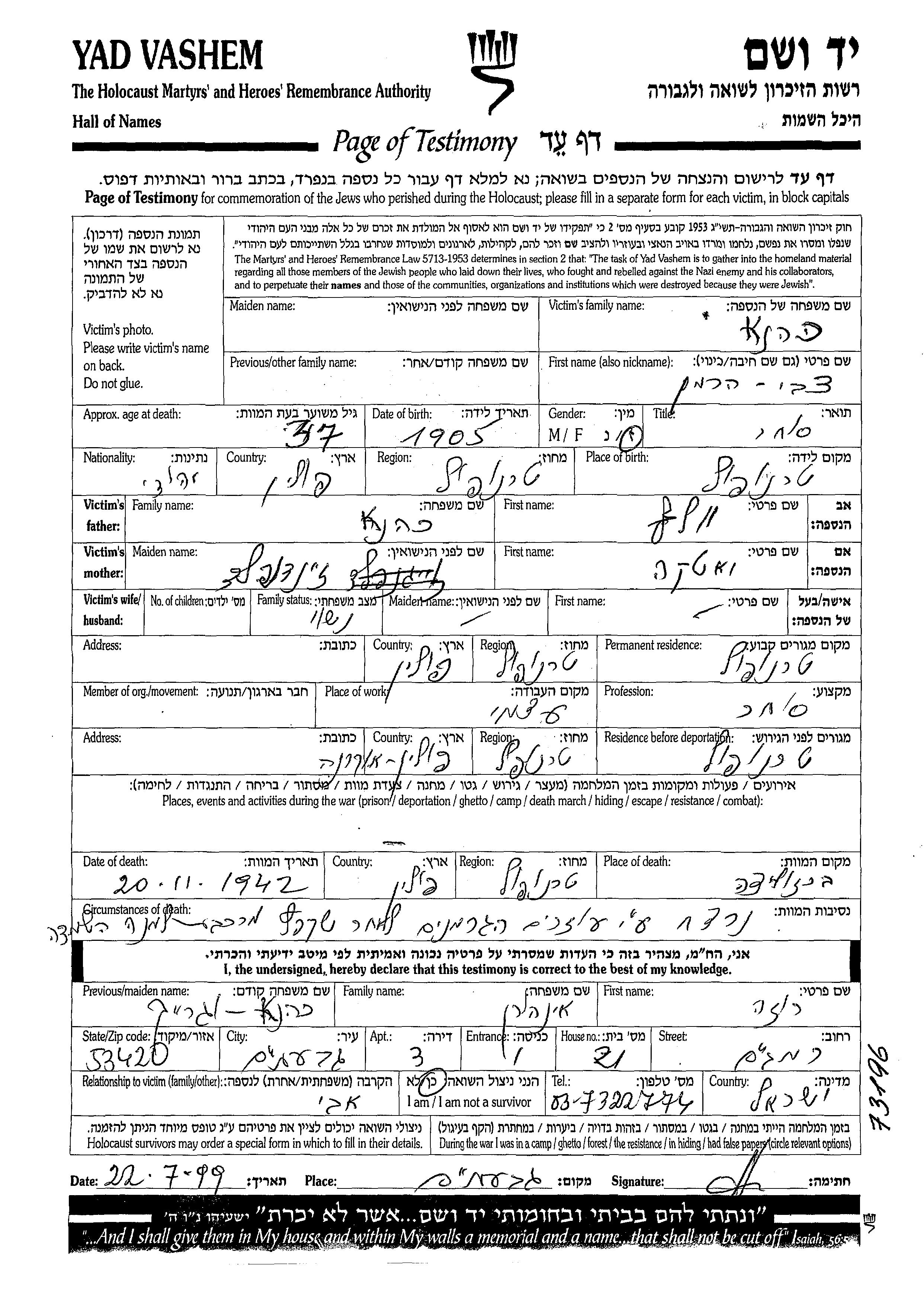 Yad Vashem - Pages of Testimony Names Memorial Collection