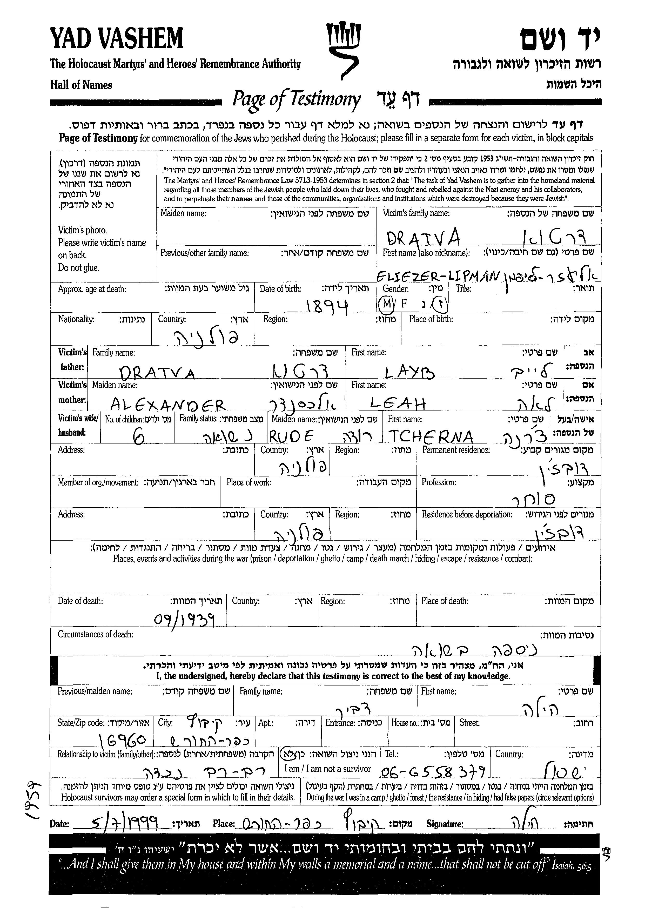 Eliezer Lipman Dratva est né à Pologne en 1894, fils de Layb et de Leah. Il était Commerçant/e et Mariée à Tcherna née Rude. Avant la seconde guerre mondiale il vivait à Dobrzyn, Pologne. Au cours de la guerre, il était à Dobrzyn, Pologne.