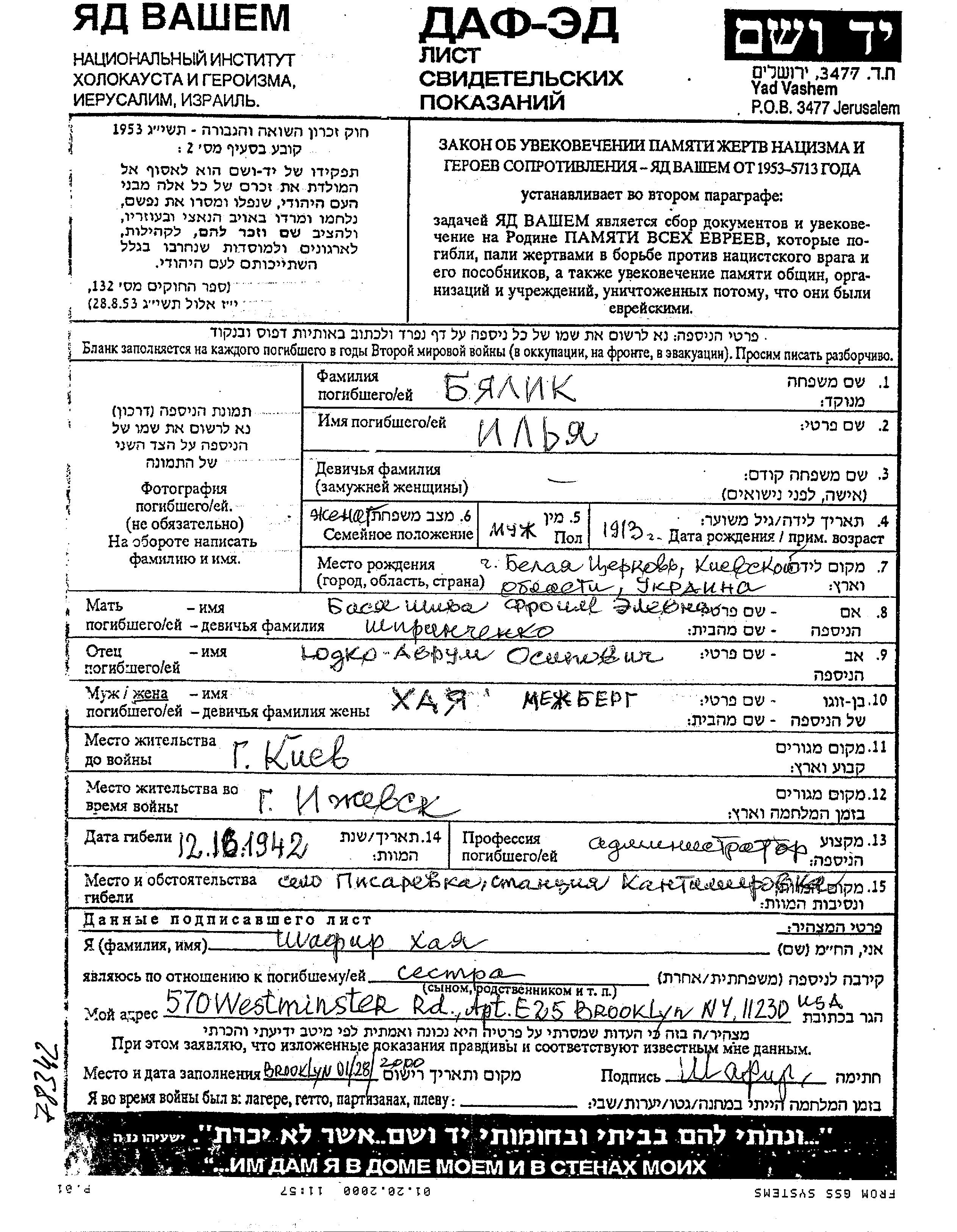 Byalik Ilya 1913 Kiev, Ukraine (URSS) Feuille de témoignage