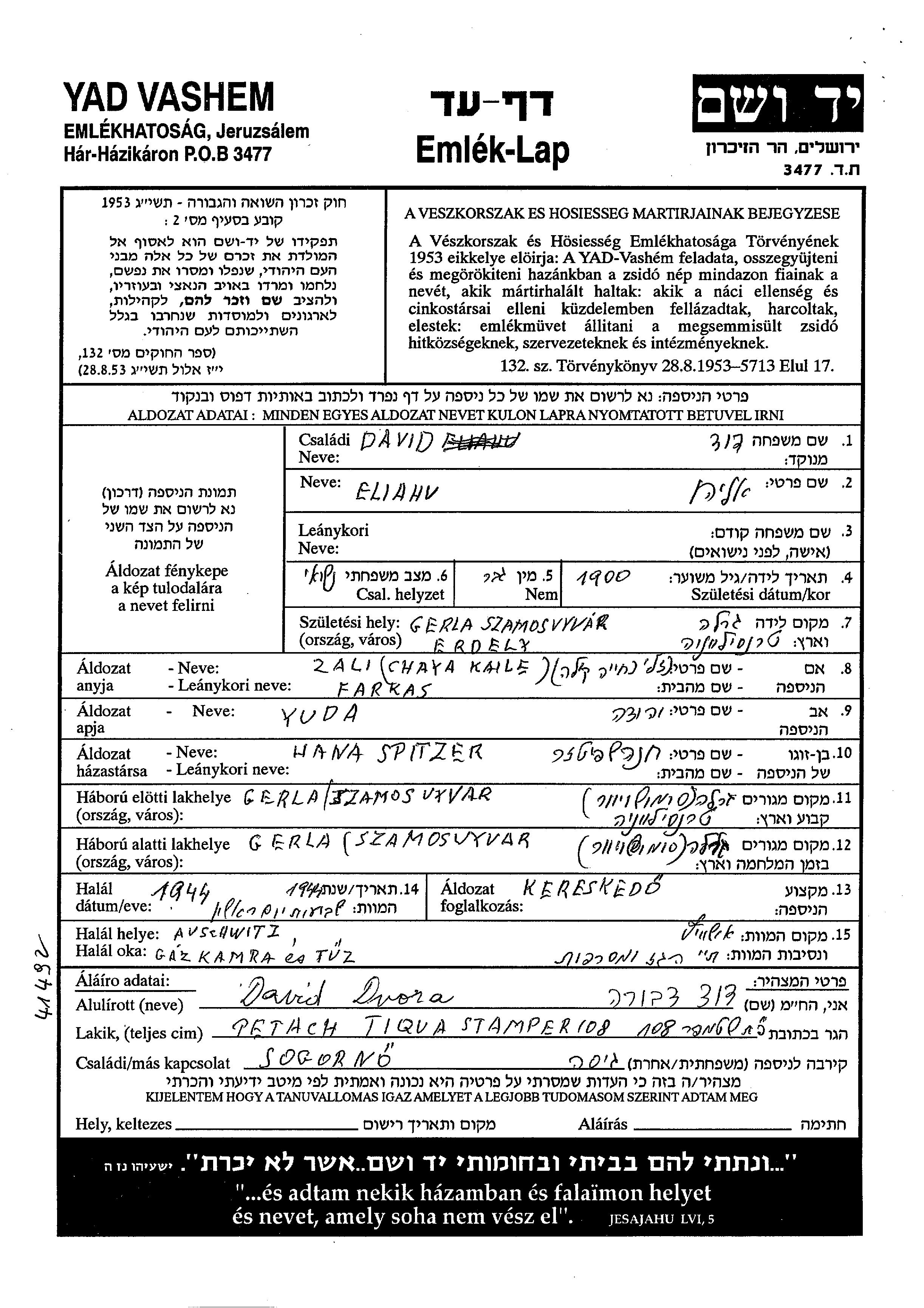 Eliahu David est né à Gerla, Roumanie en 1900, fils de Yuda et de Chaya Zali. Il était Commerçant/e et Mariée à Hana née Spitzer. Avant la seconde guerre mondiale il vivait à Gerla, Roumanie. Au cours de la guerre, il était à Gerla, Roumanie.