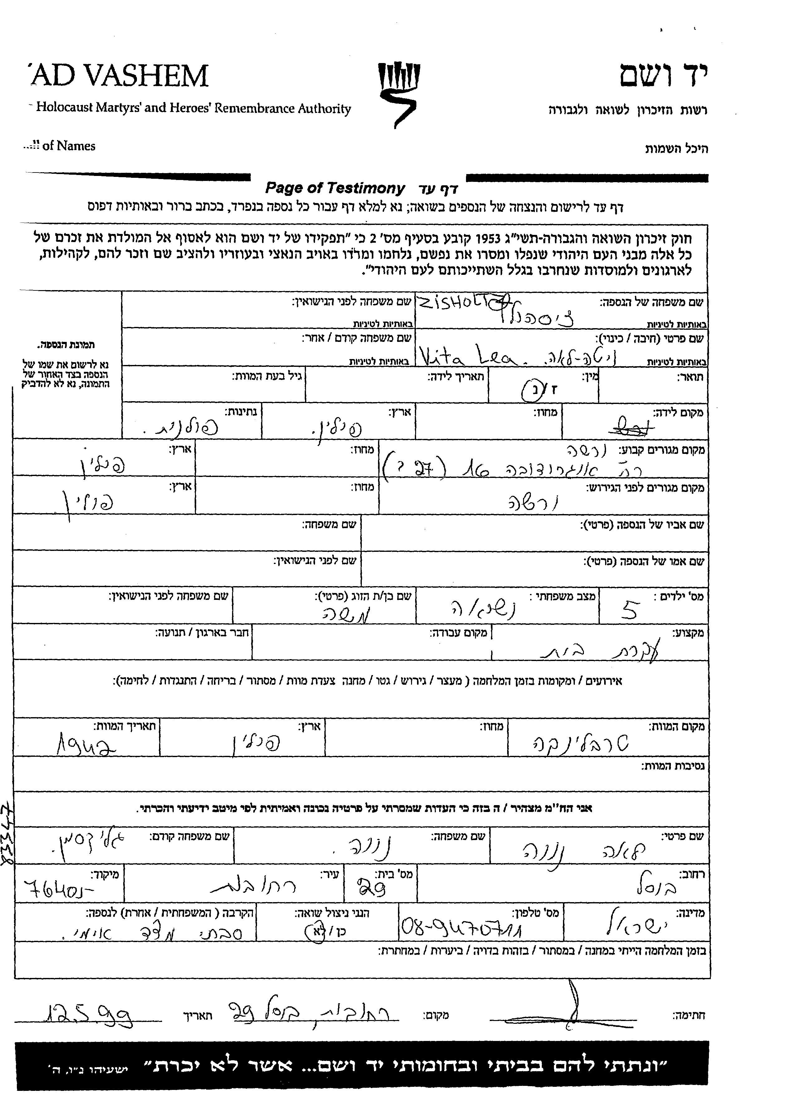 Vita Lea a été assassinée pendant la Shoah. Lieu de la mort: Treblinka, Pologne en 1942.
