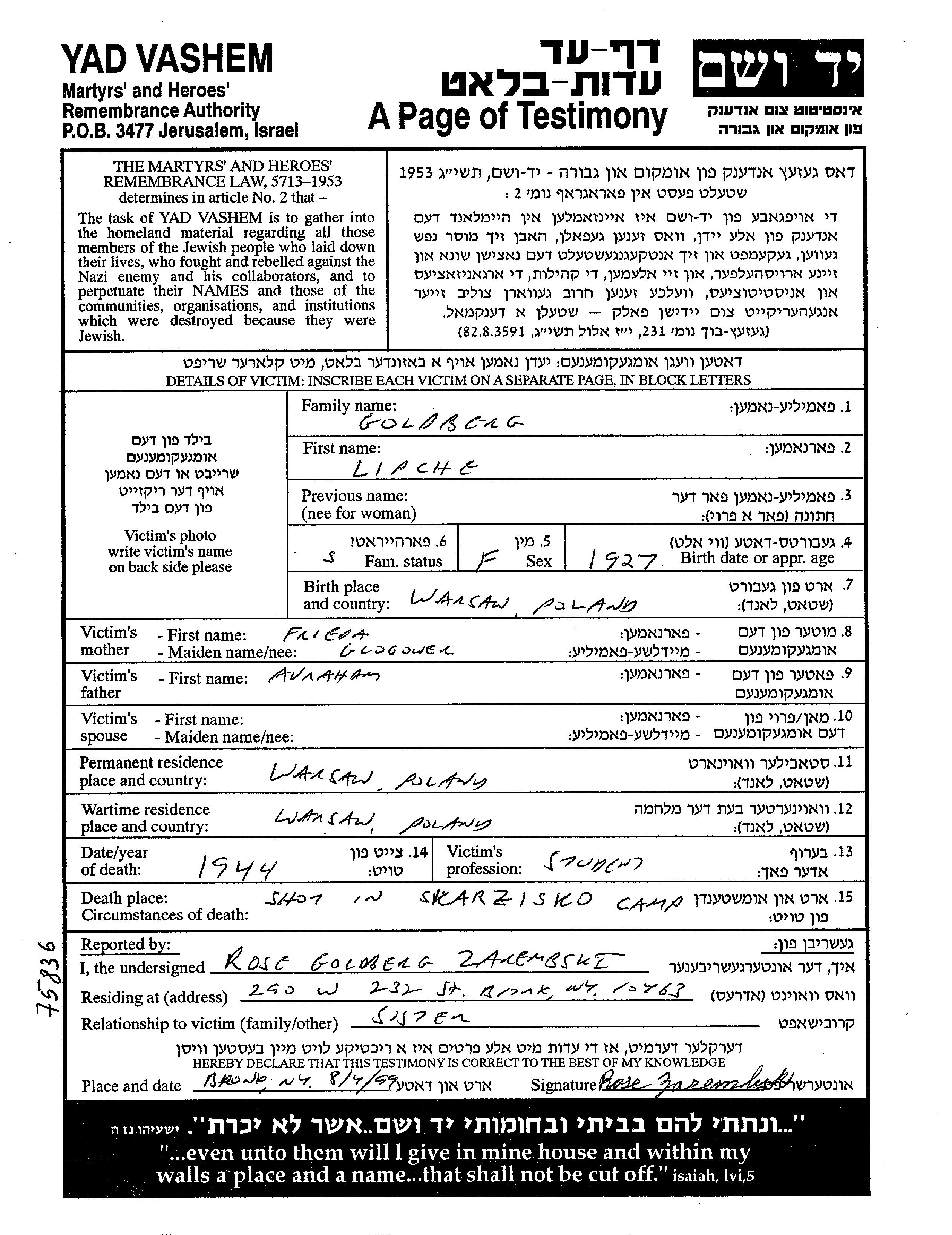 Lipsche Goldberg est née à Warszawa, Pologne en 1927, fille de Avraham et de Frieda. Elle était Étudiant/e et Célibataire. Avant la seconde guerre mondiale elle vivait à Warszawa, Pologne. Pendant la guerre, elle était à Warszawa, Pologne.