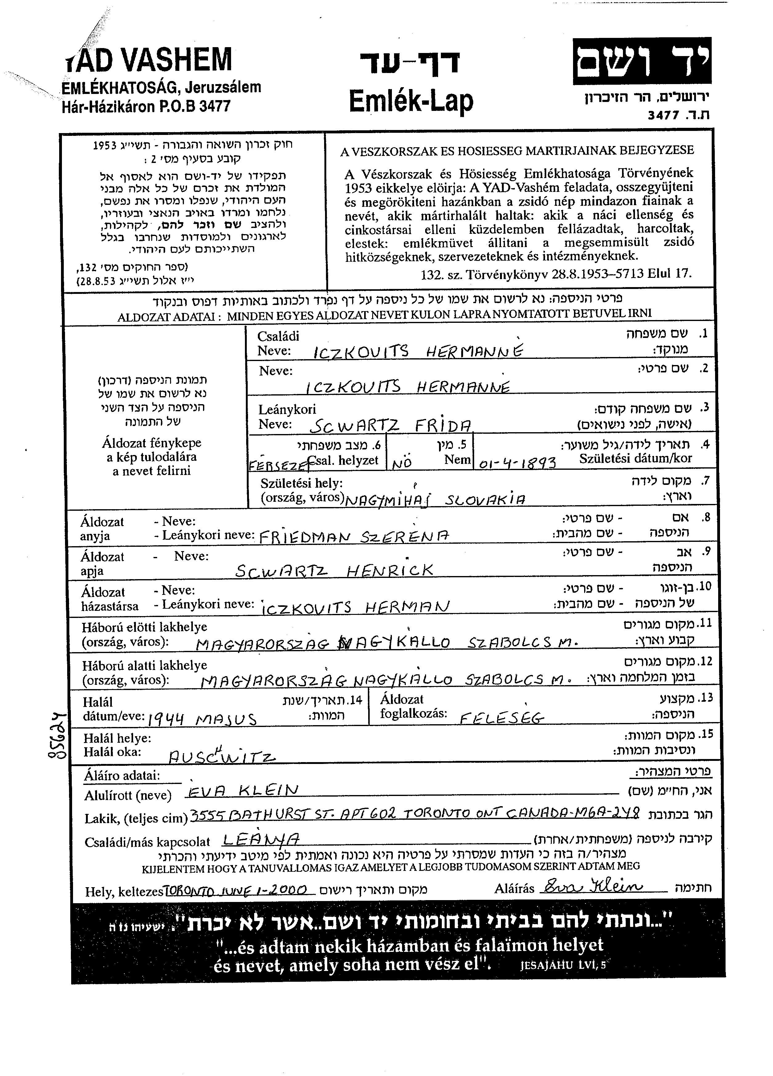 Iczkovits Frida 1893 Nagykalna, Tchécoslovaquie Feuille de témoignage