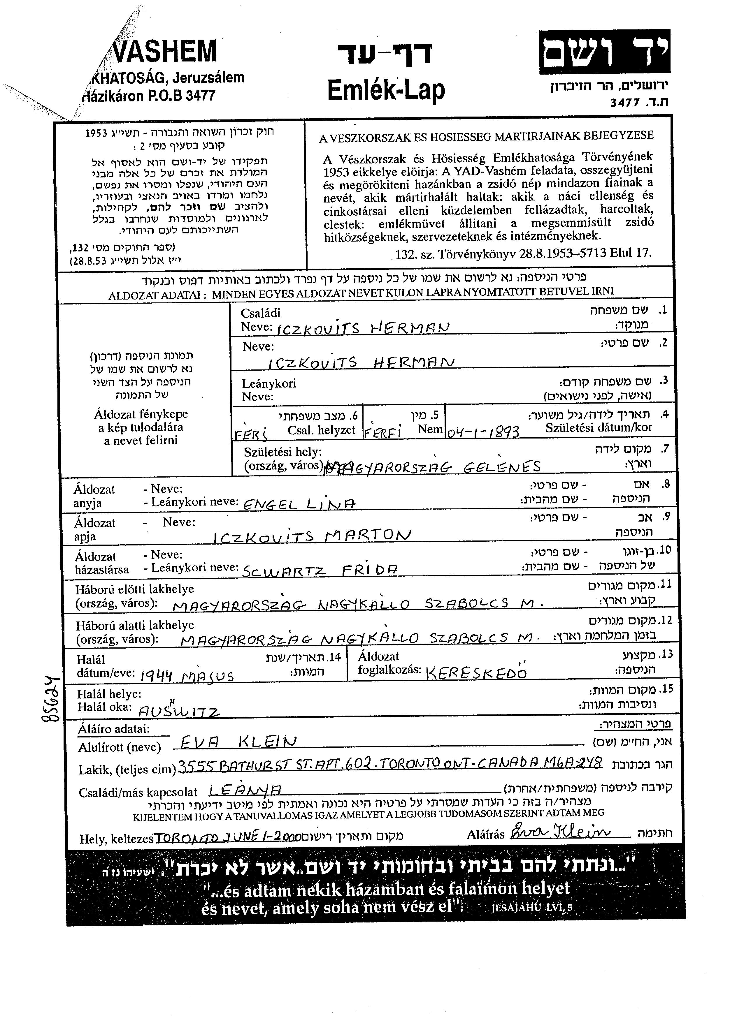 Iczkovits Herman 1893 Nagykallo, Hongrie Feuille de témoignage