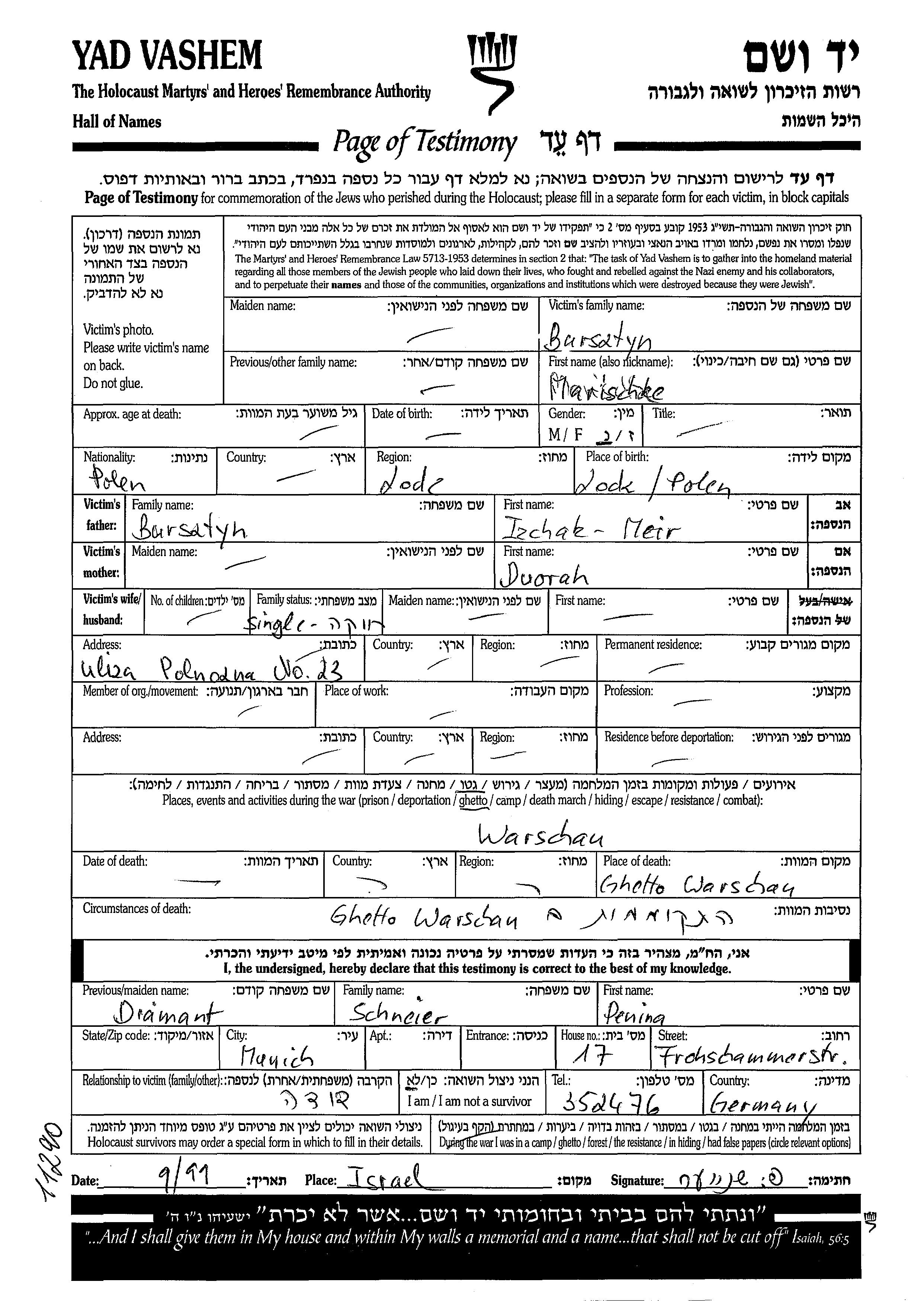 Marischke Bursztyn est née à Lodz, Pologne, fille de Izchak Meir et de Dvora. Elle était Célibataire. Avant la seconde guerre mondiale elle vivait à Pologne. Pendant la guerre, elle était à Warszawa, Pologne.