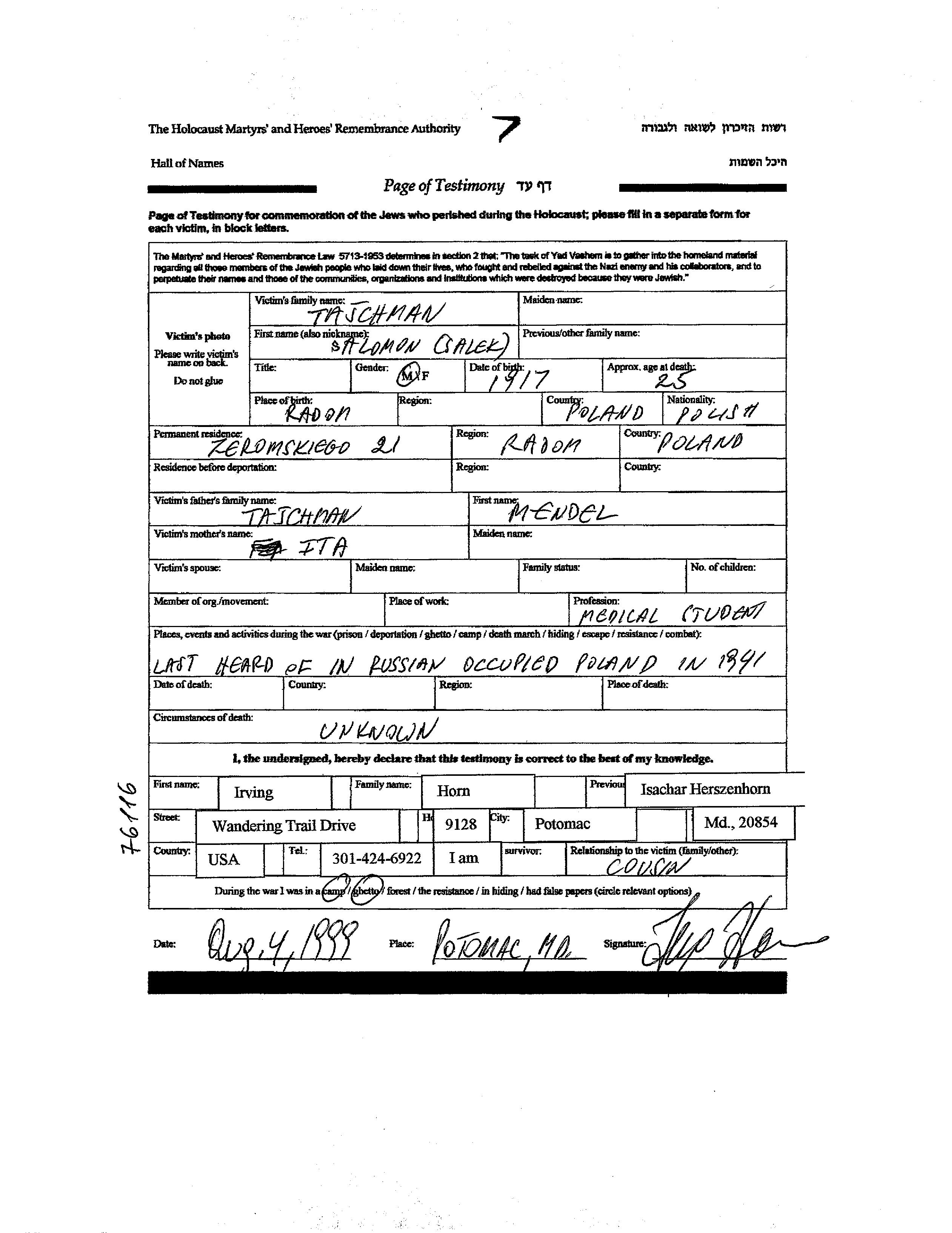 Salomon Tajchman est né à Radom, Pologne en 1917, fils de Mendel et de Ita. Il était Étudiant/e en médecine. Avant la seconde guerre mondiale il vivait à Radom, Pologne.