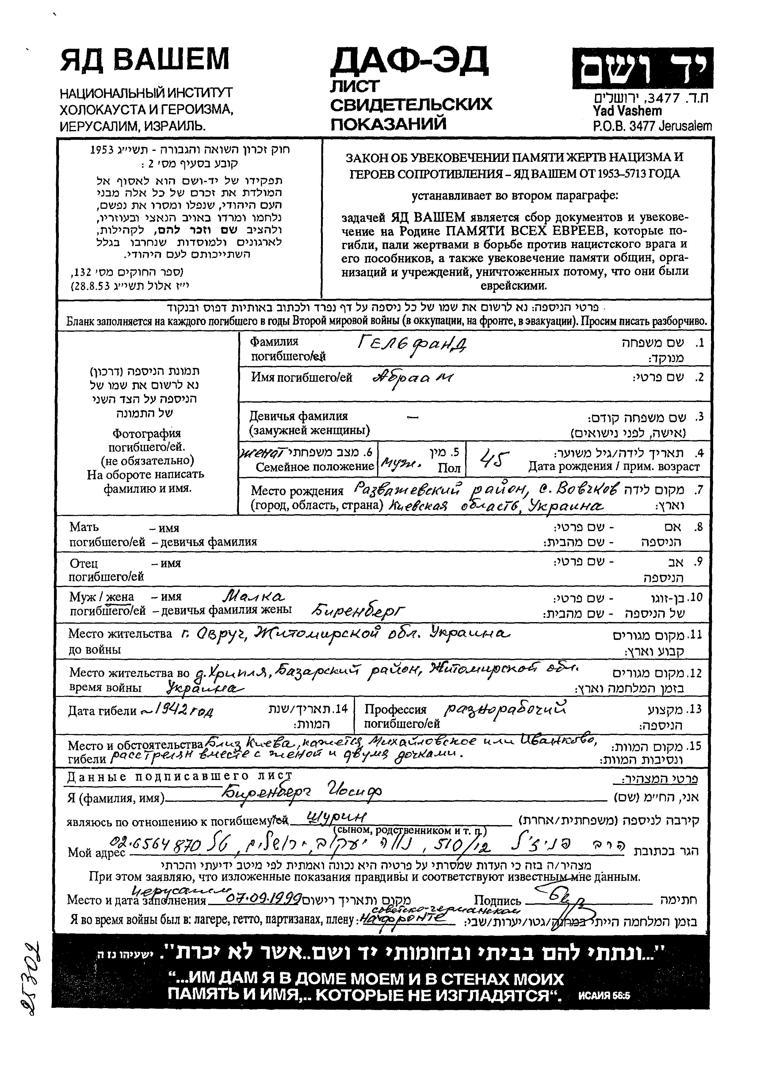 Abraam Gelfand est né à Volchkov, Ukraine (URSS). Il était Mariée à Malka née Birenberg. Avant la seconde guerre mondiale il vivait à Ovruch, Ukraine (URSS). Au cours de la guerre, il était à Khriplya, Ukraine (URSS).