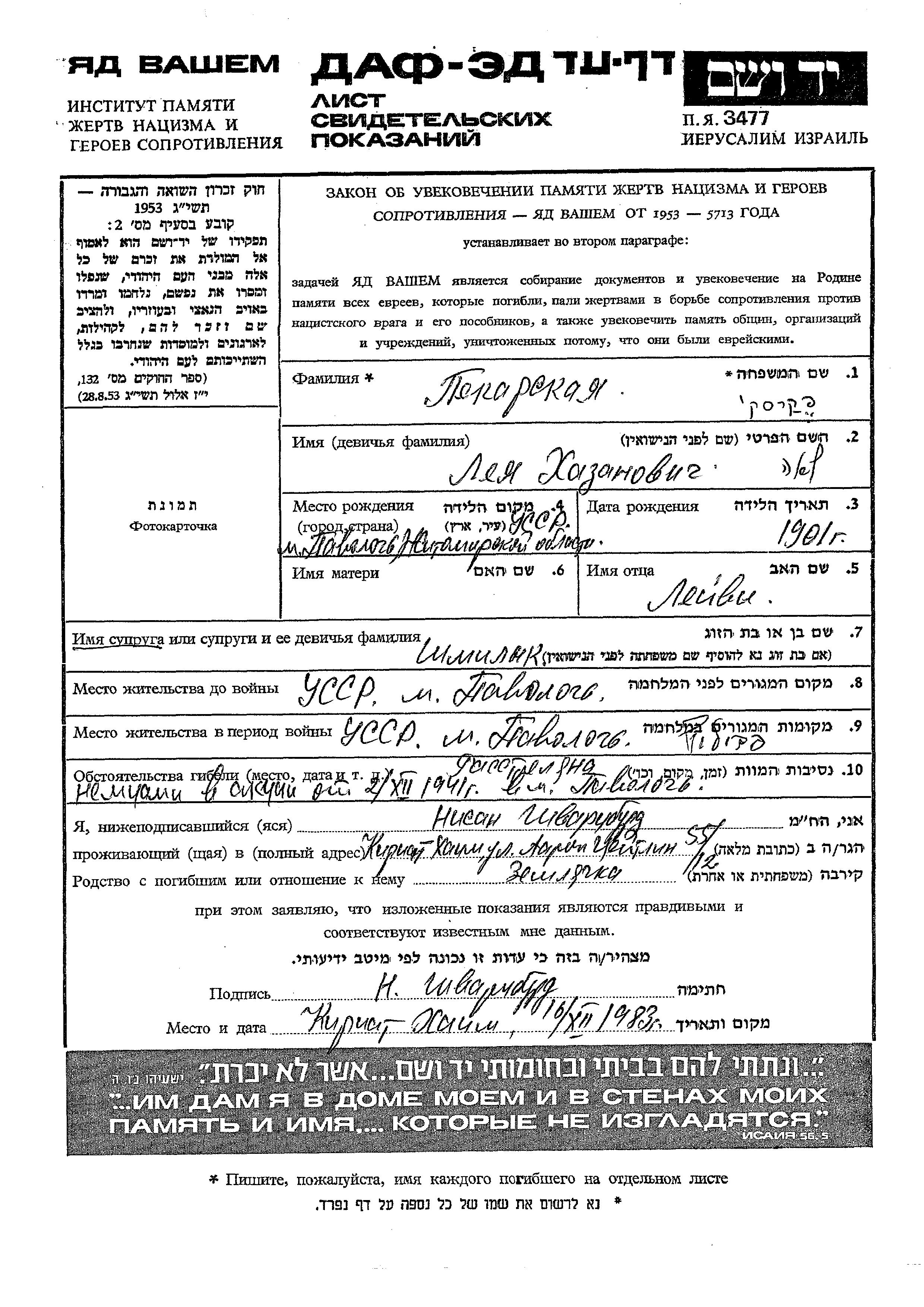 Pekarski Lea Pavoloch, Ukraine (URSS) Feuille de témoignage