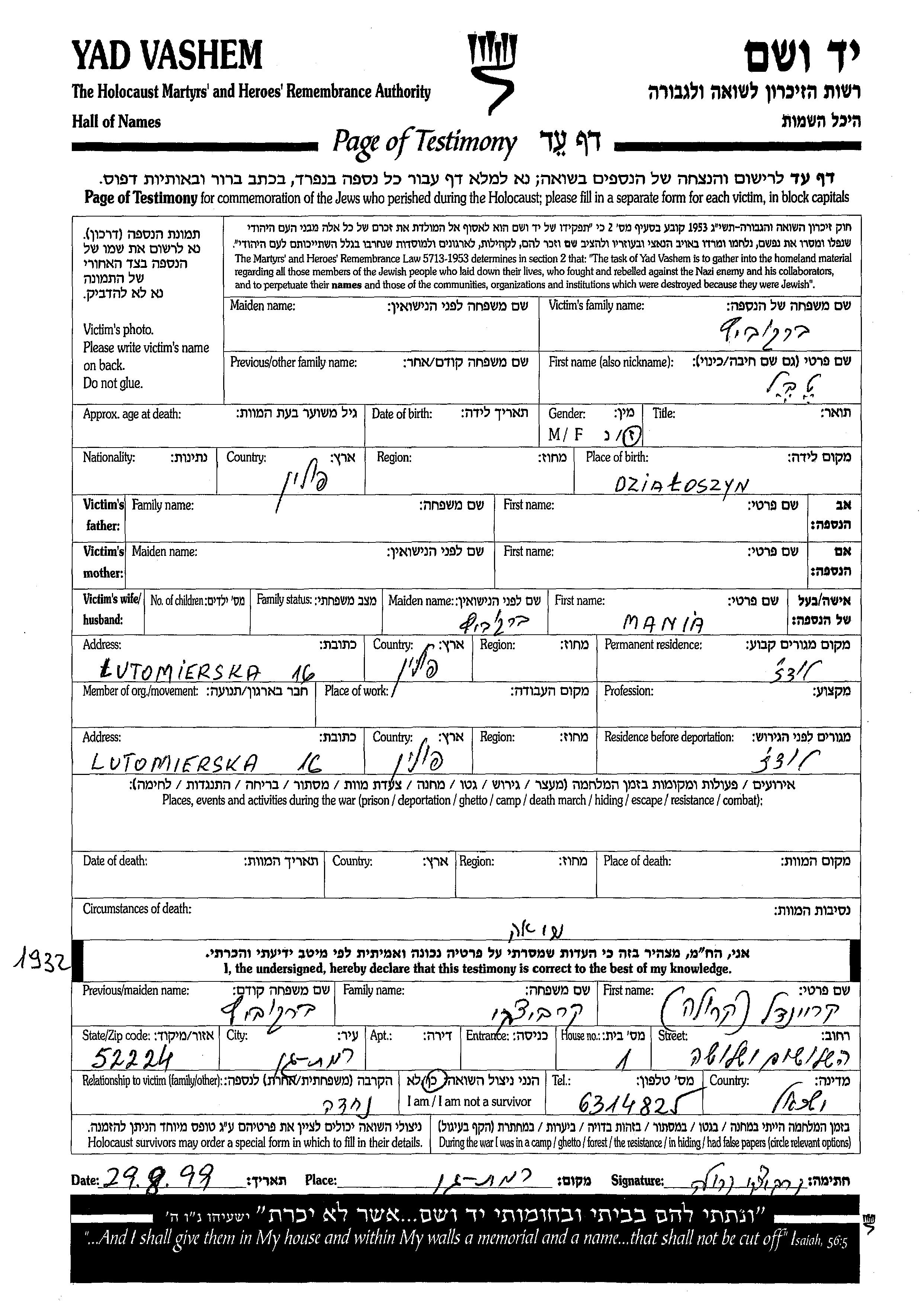 Yad Vashem - Pages of Testimony Names Memorial Collection