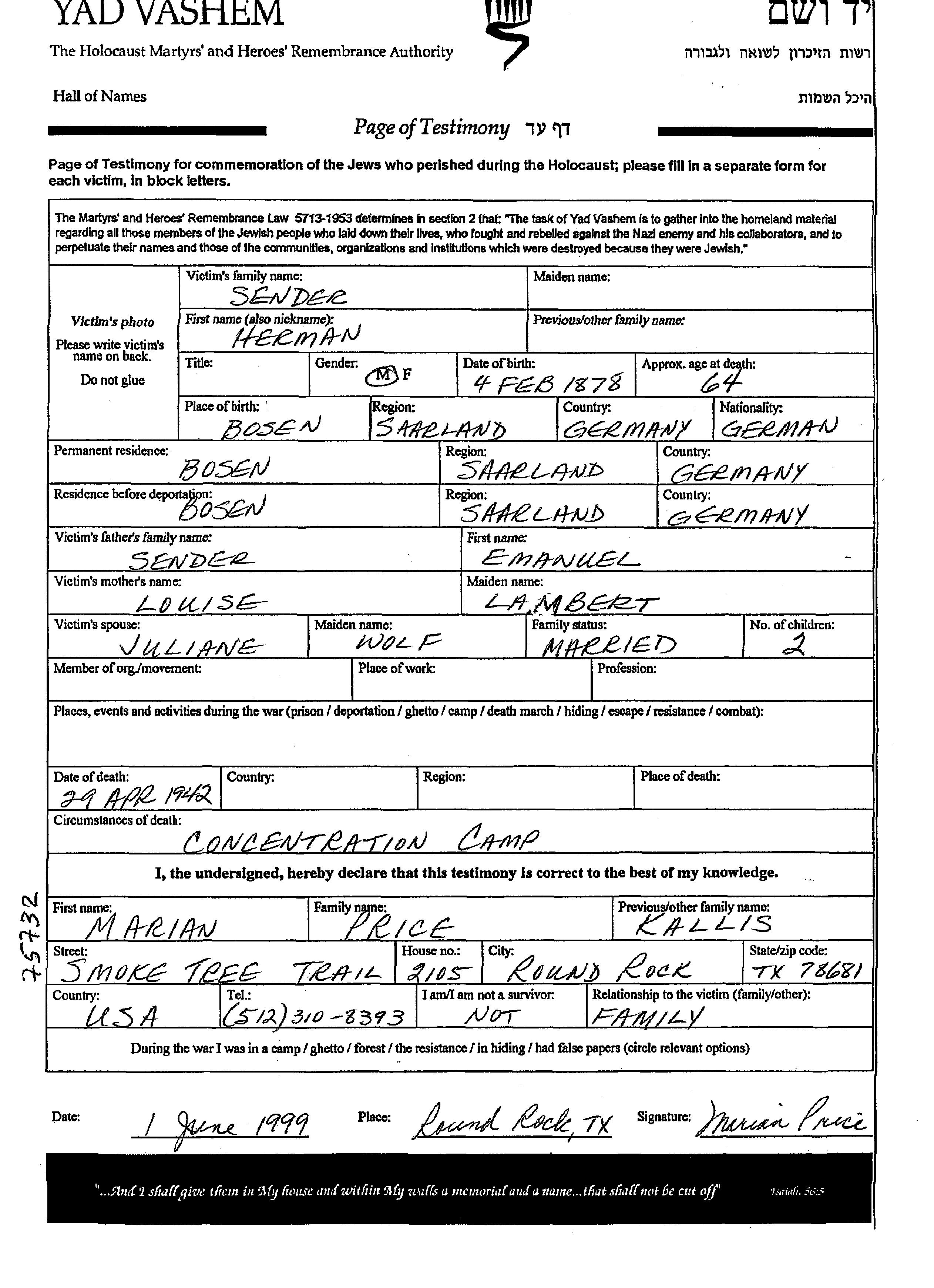 Herman Sender est né à Bosen, Allemagne en 1878, fils de Emanuel et de Louise. Il était Mariée à Juliane née Wolf. Avant la seconde guerre mondiale il vivait à Bosen, Allemagne. Au cours de la guerre, il était à Bosen, Allemagne.