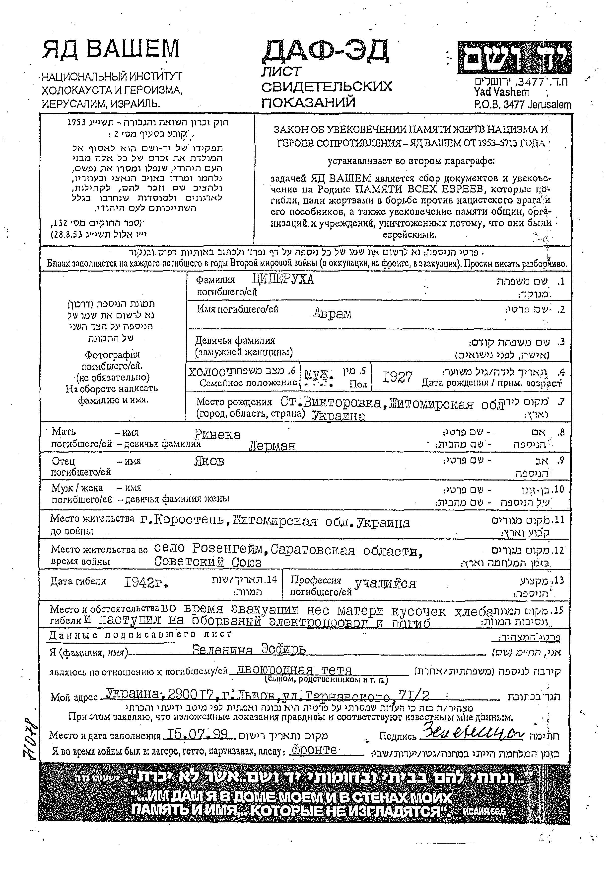 Tziperukha Avram 1927 Korosten, Ukraine (URSS) Feuille de témoignage