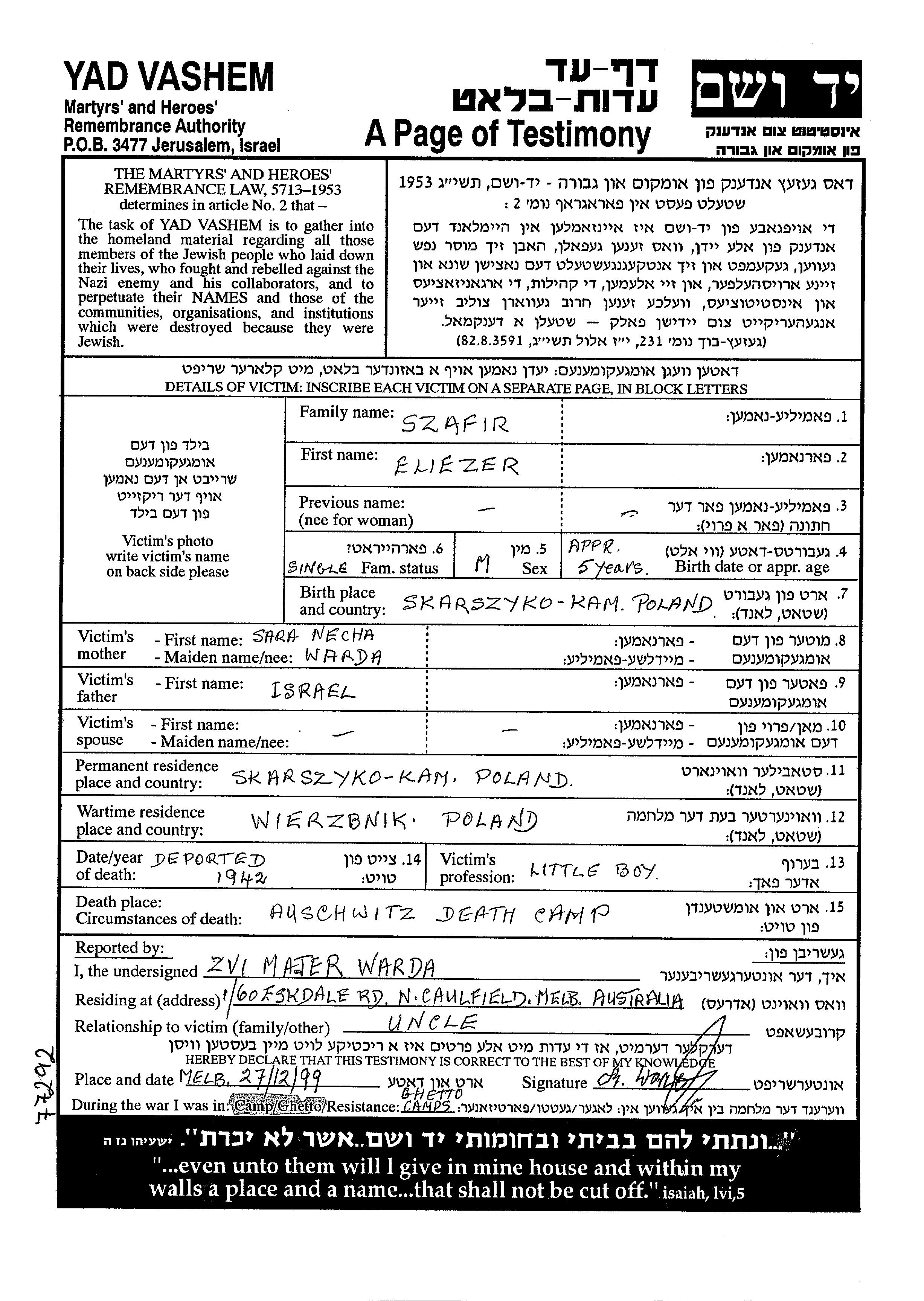 Szafir Eliezer Skarzysko Kamienna, Pologne Feuille de témoignage