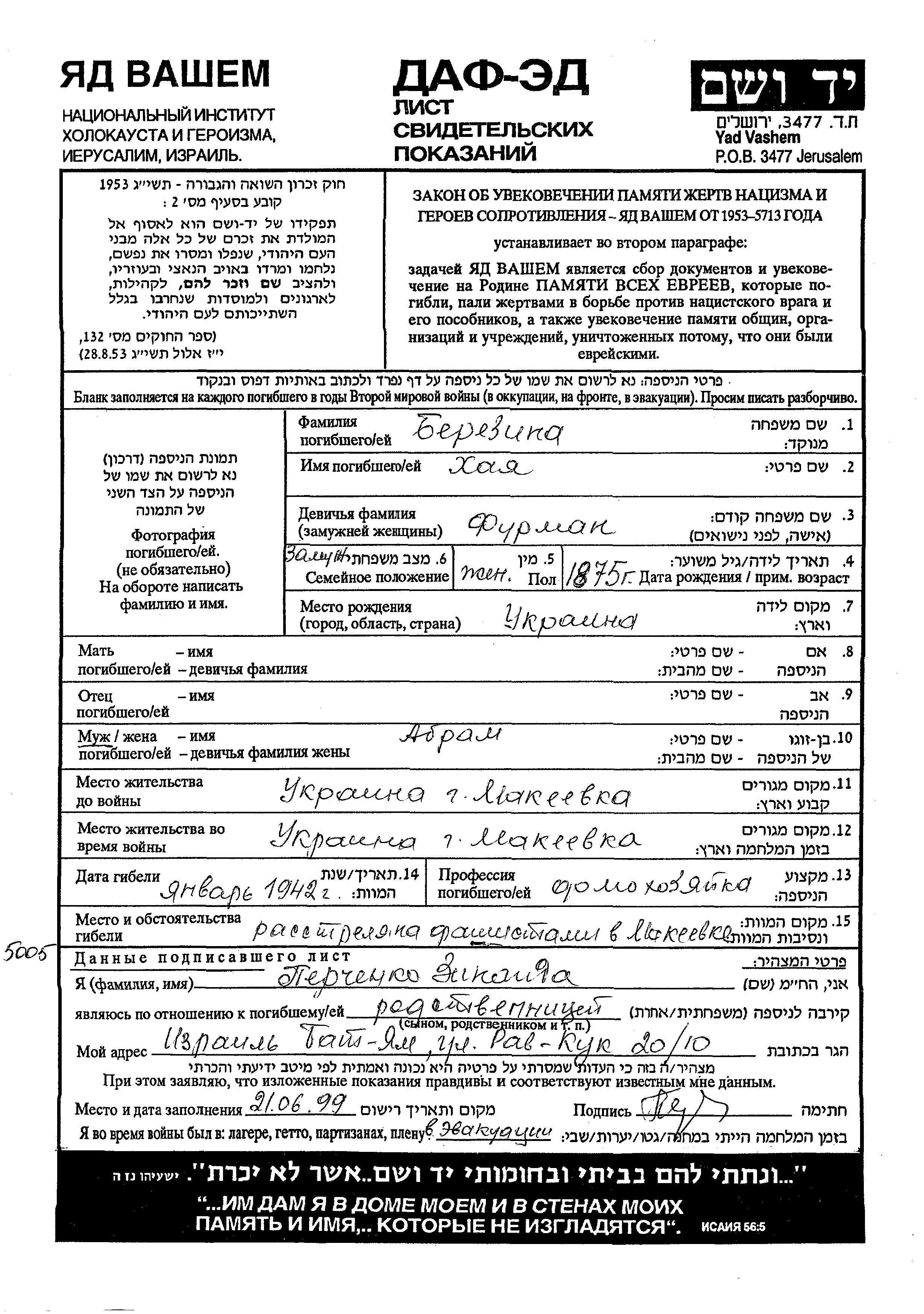 Yad Vashem - Pages of Testimony Names Memorial Collection