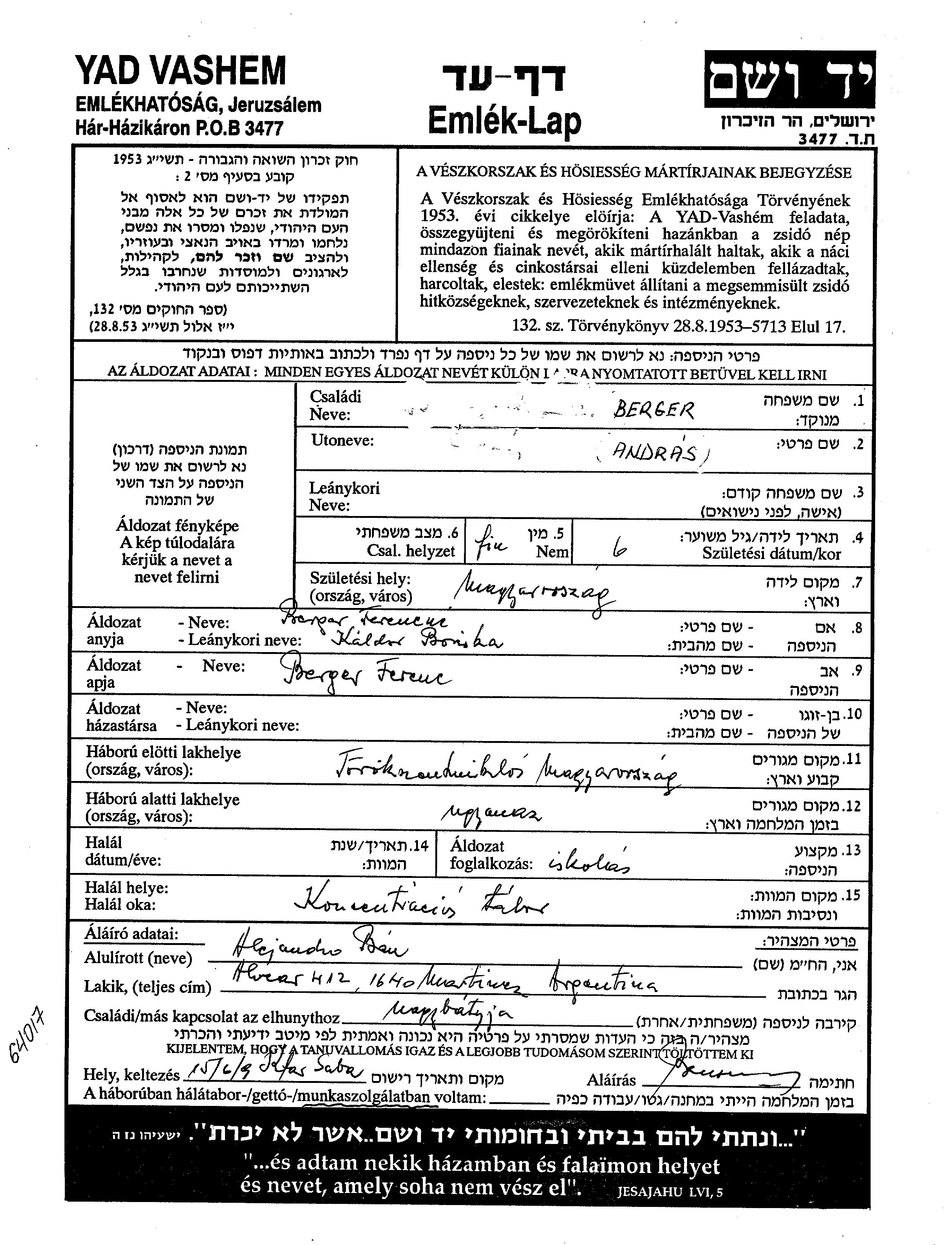 Andras Berger est né à Hongrie, fils de Borbala née Kaldor. Avant la seconde guerre mondiale il vivait à Torokszentmiklos, Hongrie. Au cours de la guerre, il était à Torokszentmiklos, Hongrie.