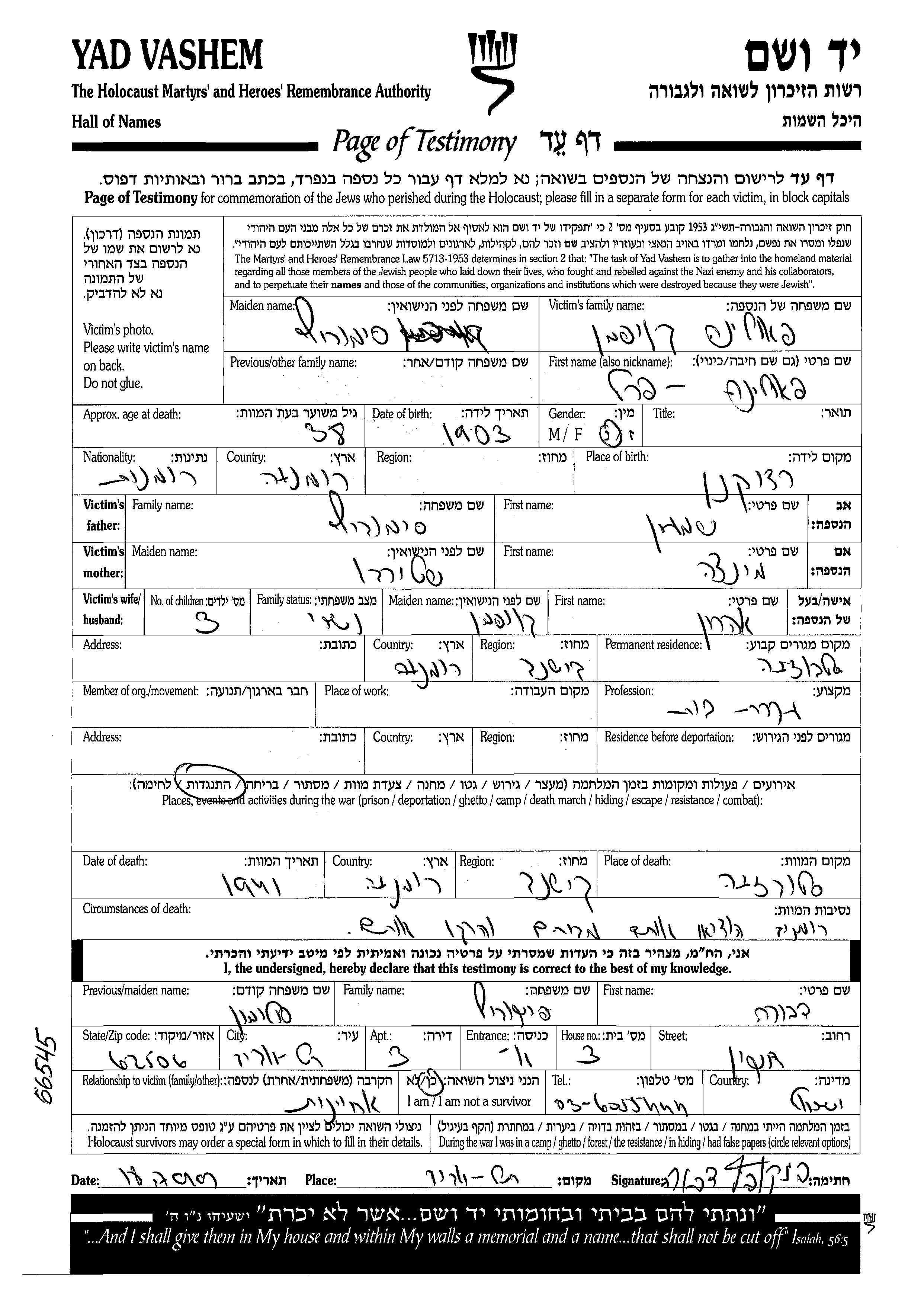 Yad Vashem - Pages of Testimony Names Memorial Collection