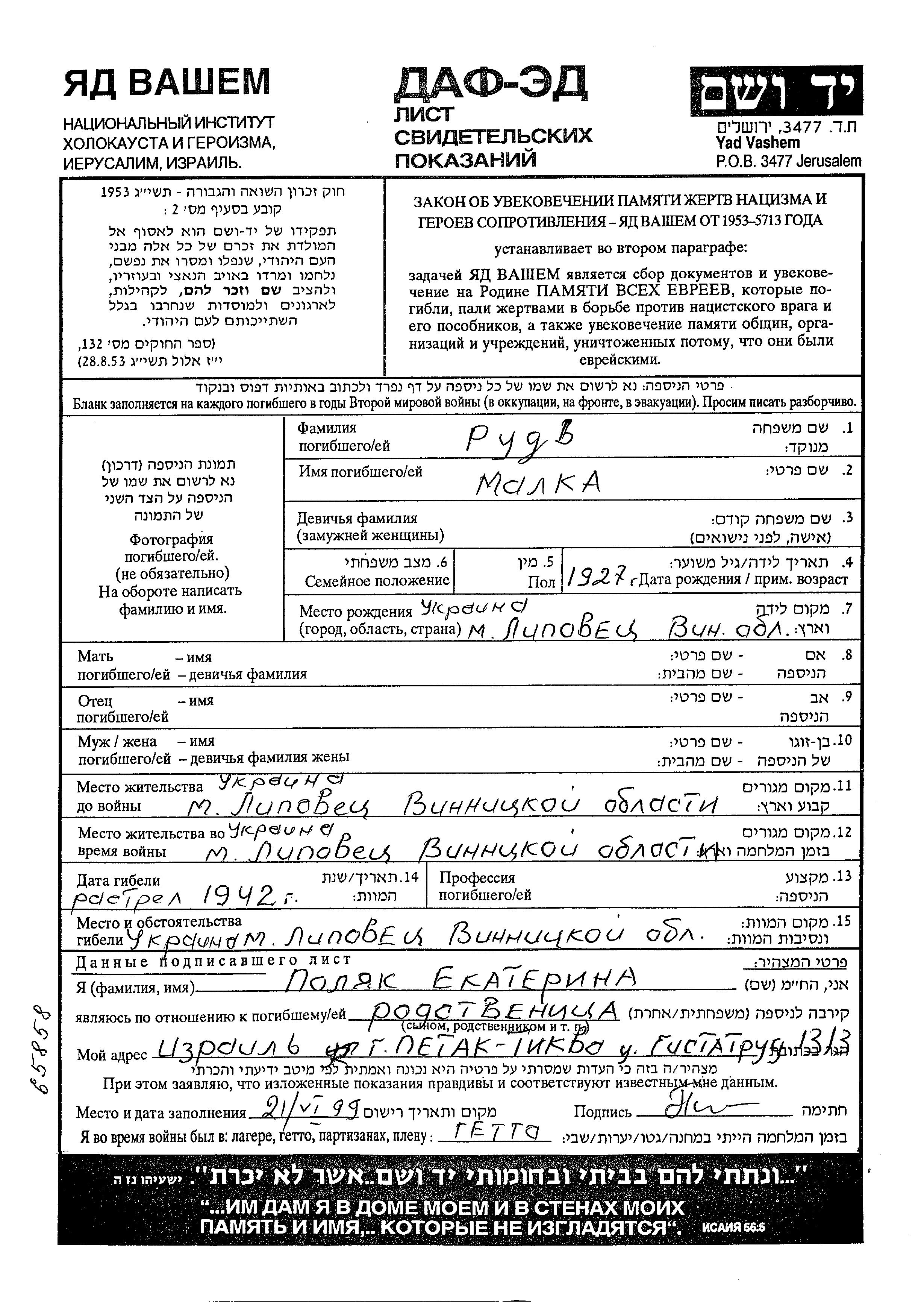 Rud Malka 1927 Lipovets, Ukraine (URSS) Feuille de témoignage