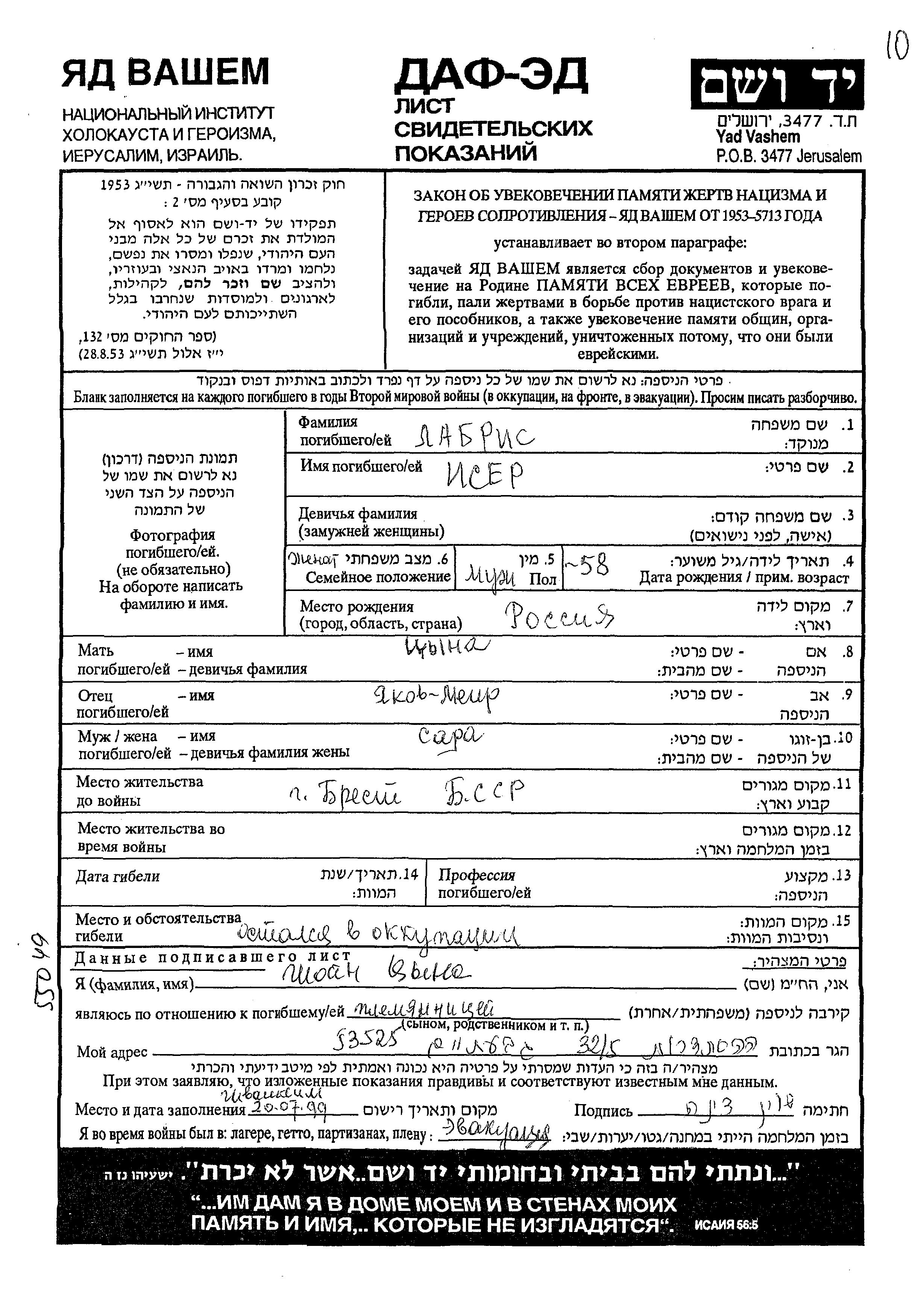 Labris Isser Brest, Pologne Feuille de témoignage