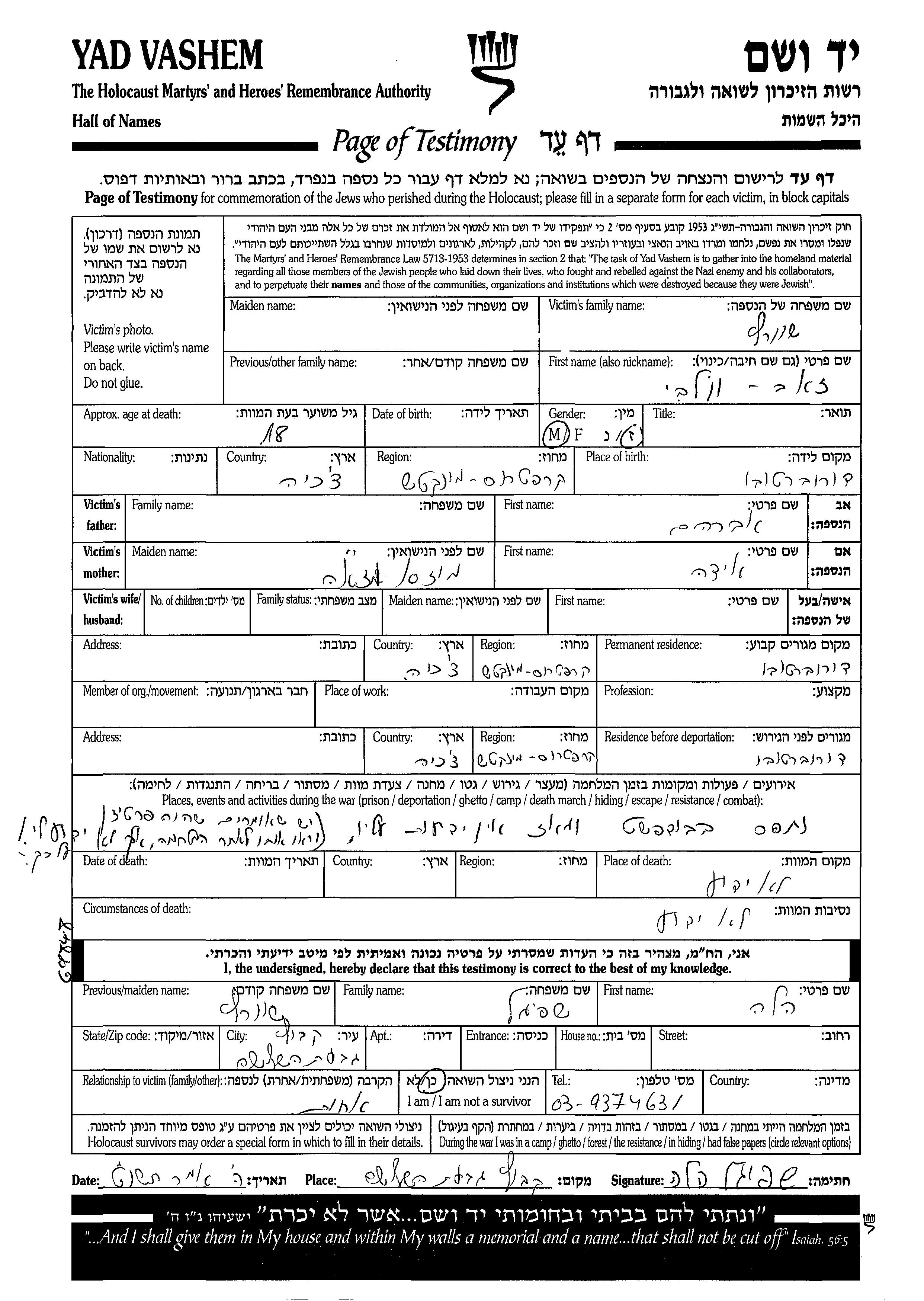 Yad Vashem - Pages of Testimony Names Memorial Collection