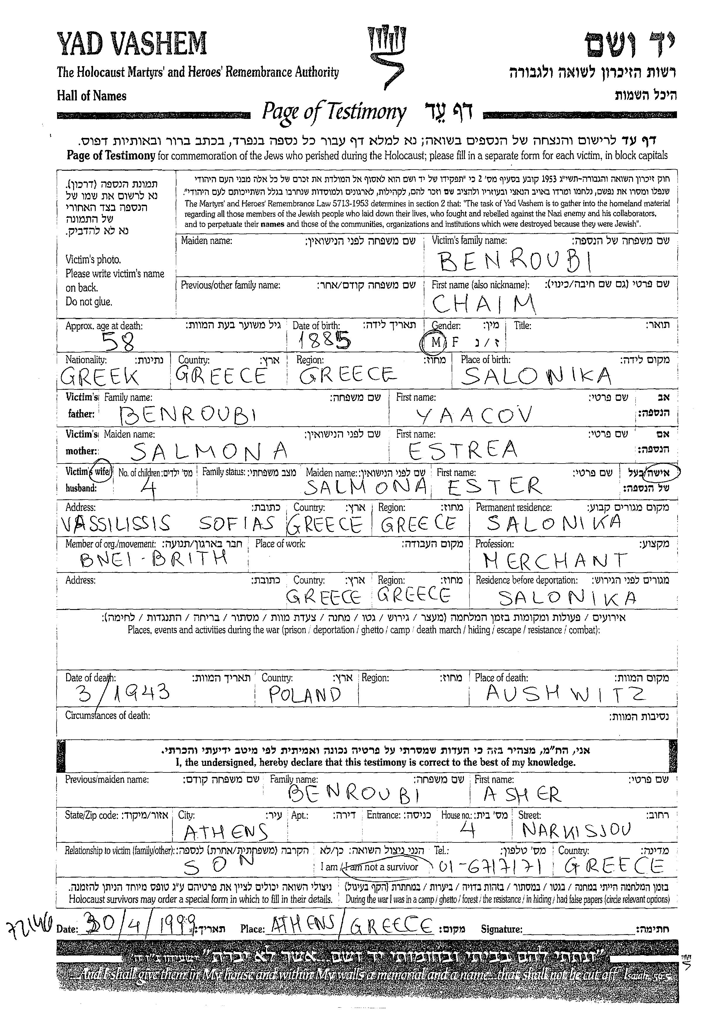 Benroubi Chaim 1885 Thessaloniki, Grèce Feuille de témoignage