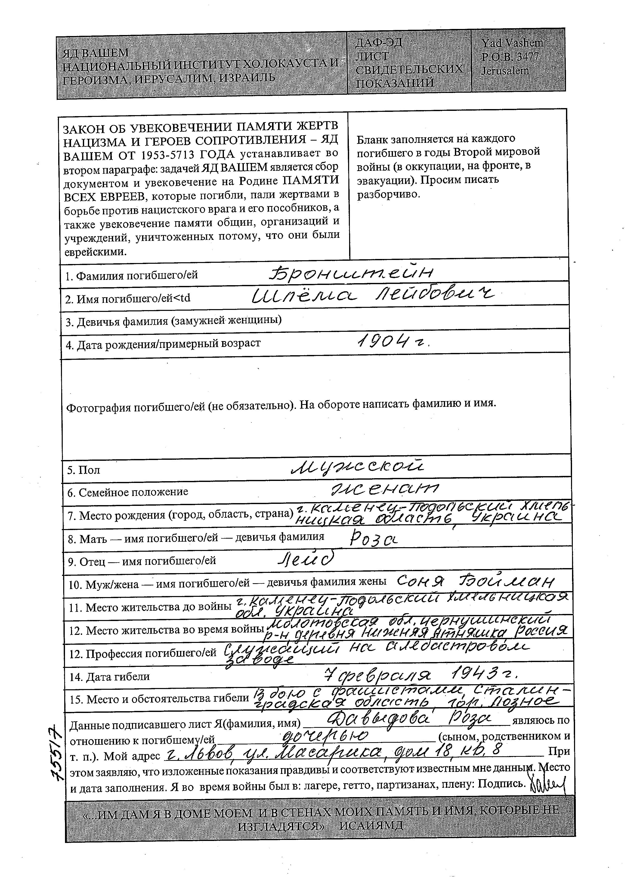 Bronshtein Shlyoma 1904 Kamenets Podolskiy, Ukraine (URSS) Feuille de témoignage