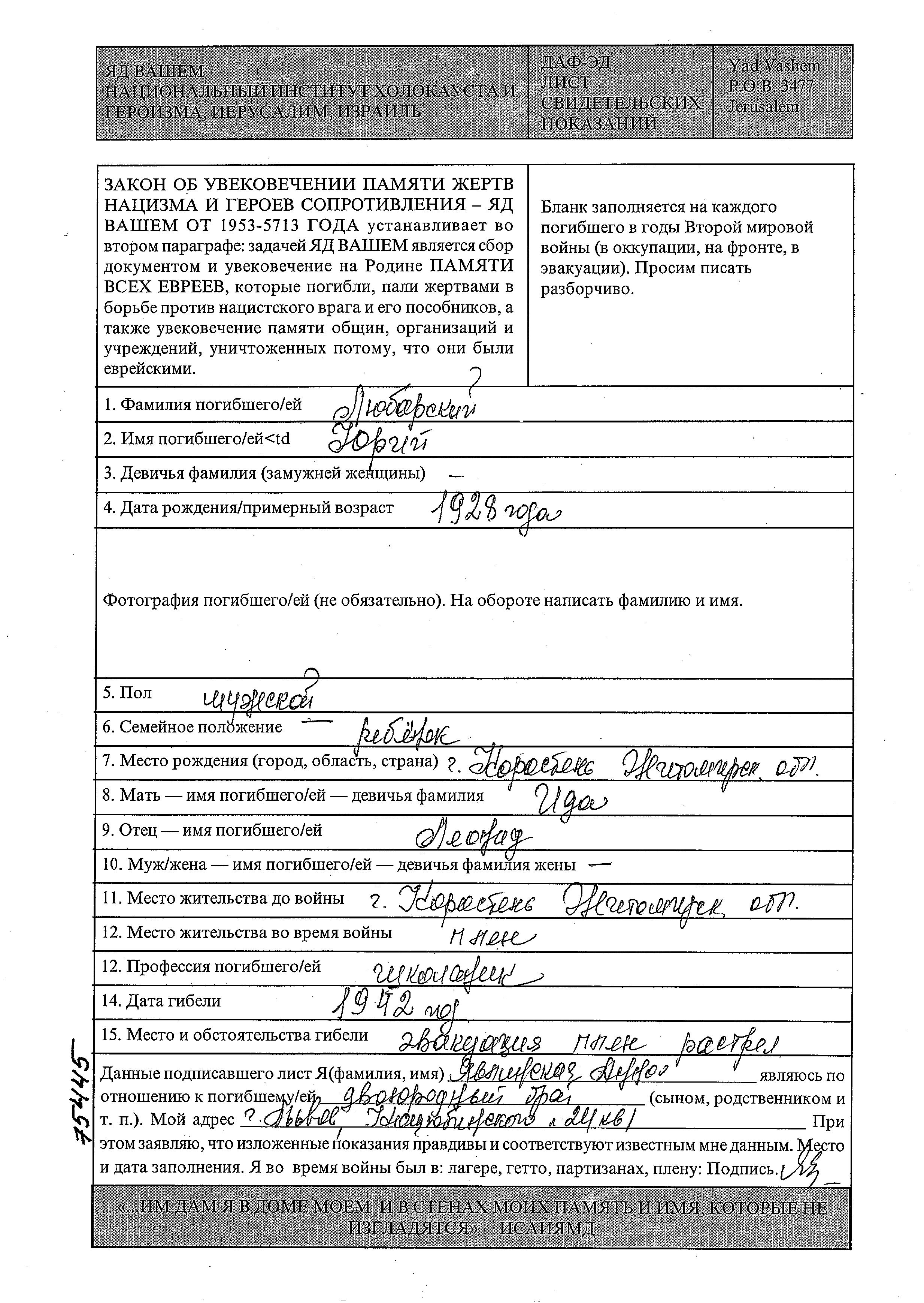 Lyubarski Yuri 1928 Korosten, Ukraine (URSS) Feuille de témoignage