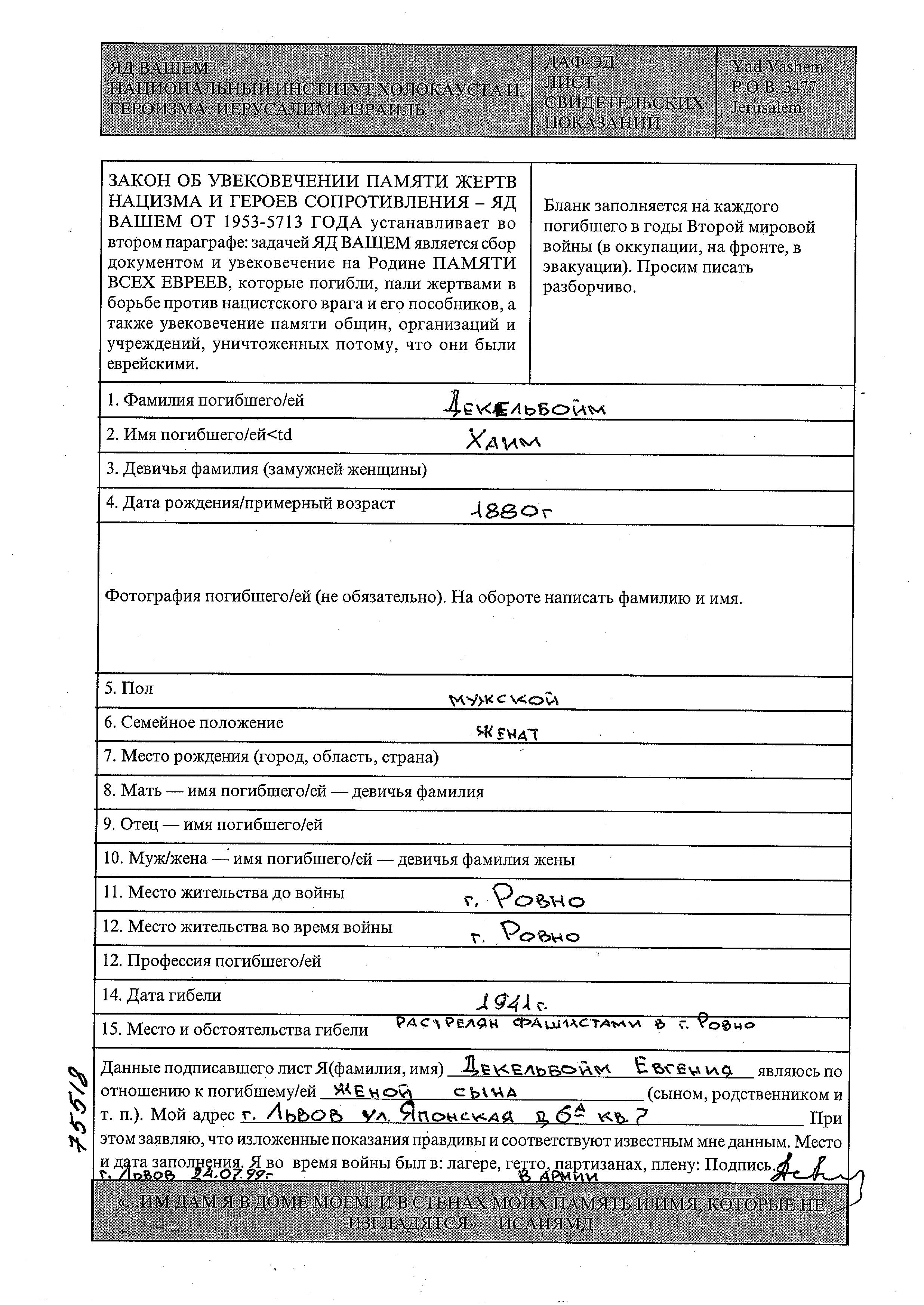 Dekelboim Khaim 1880 Rowne, Pologne Feuille de témoignage