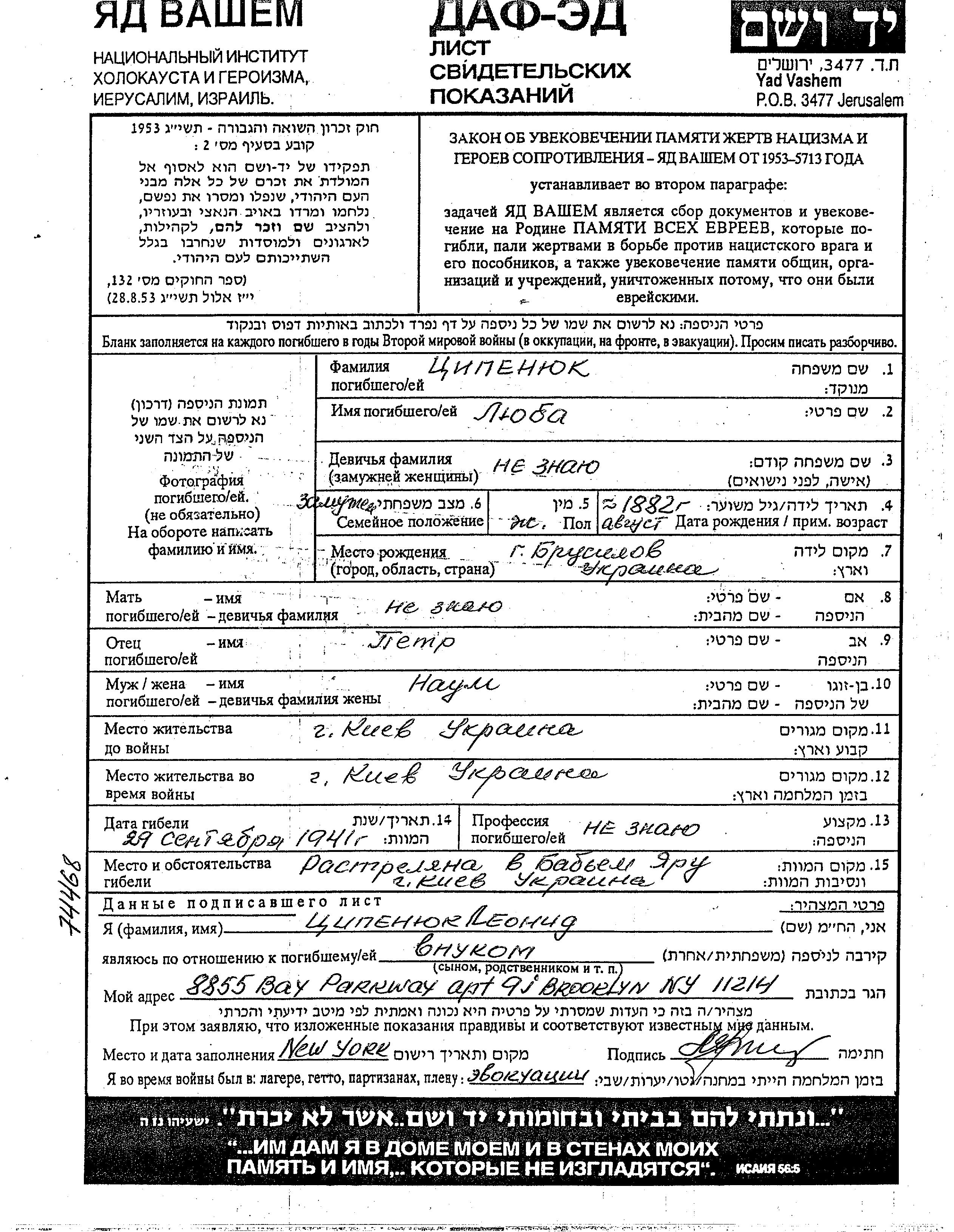Tzipenyuk Lyuba 1882 Kiyev, Ukraine (URSS) Feuille de témoignage