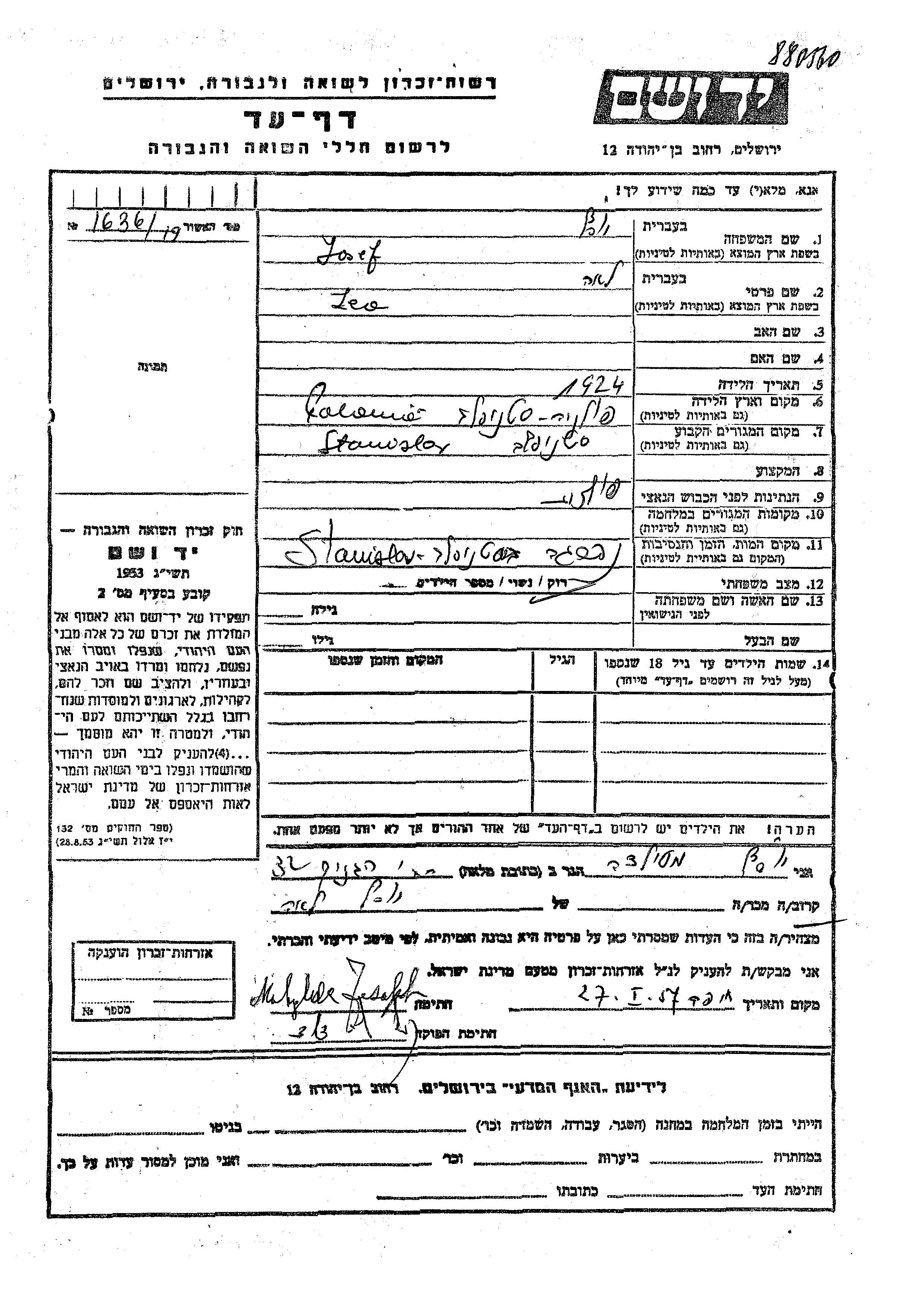 Iosef Lea 1924 Stanislawow, Pologne Feuille de témoignage