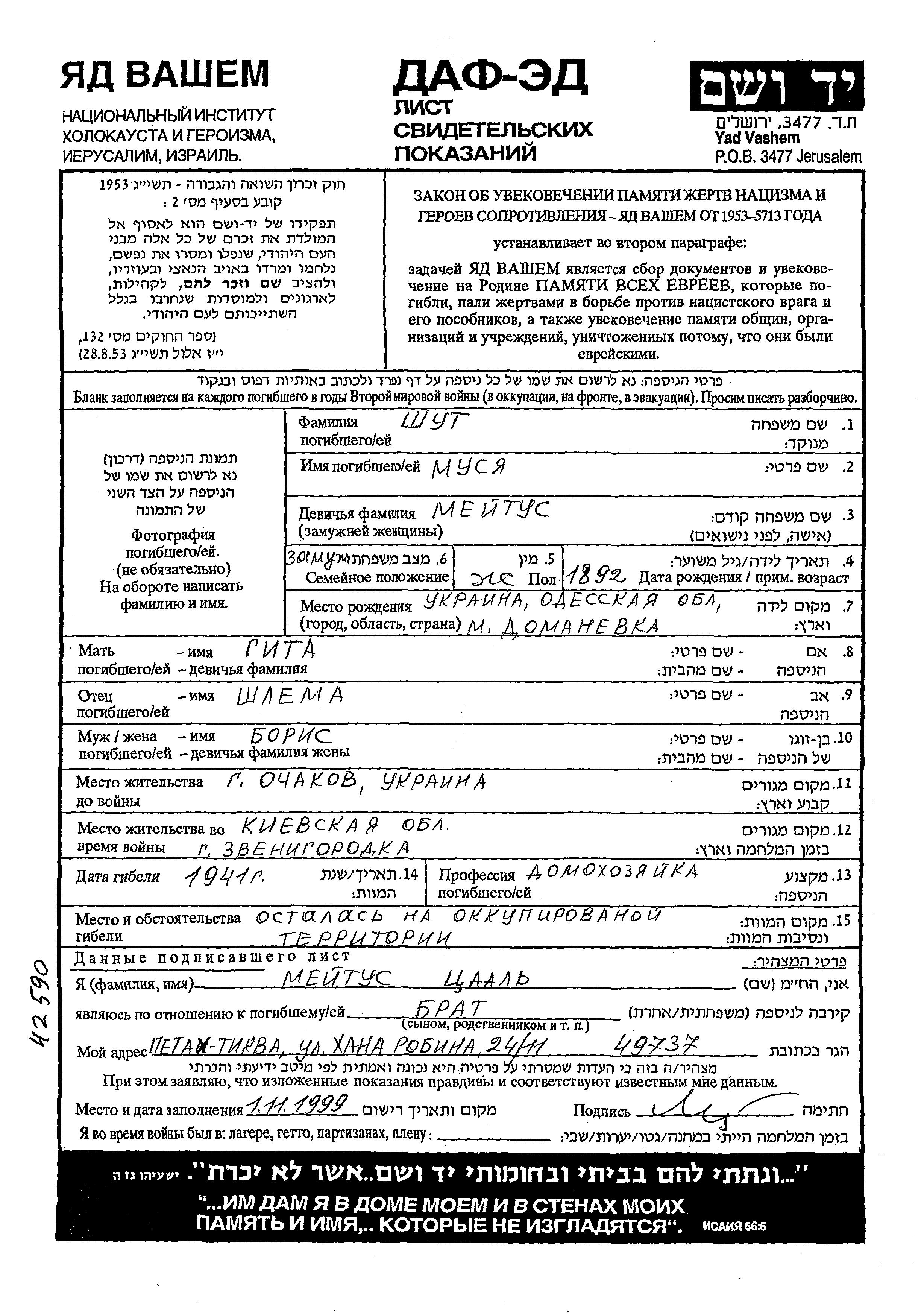 Yad Vashem - Pages of Testimony Names Memorial Collection