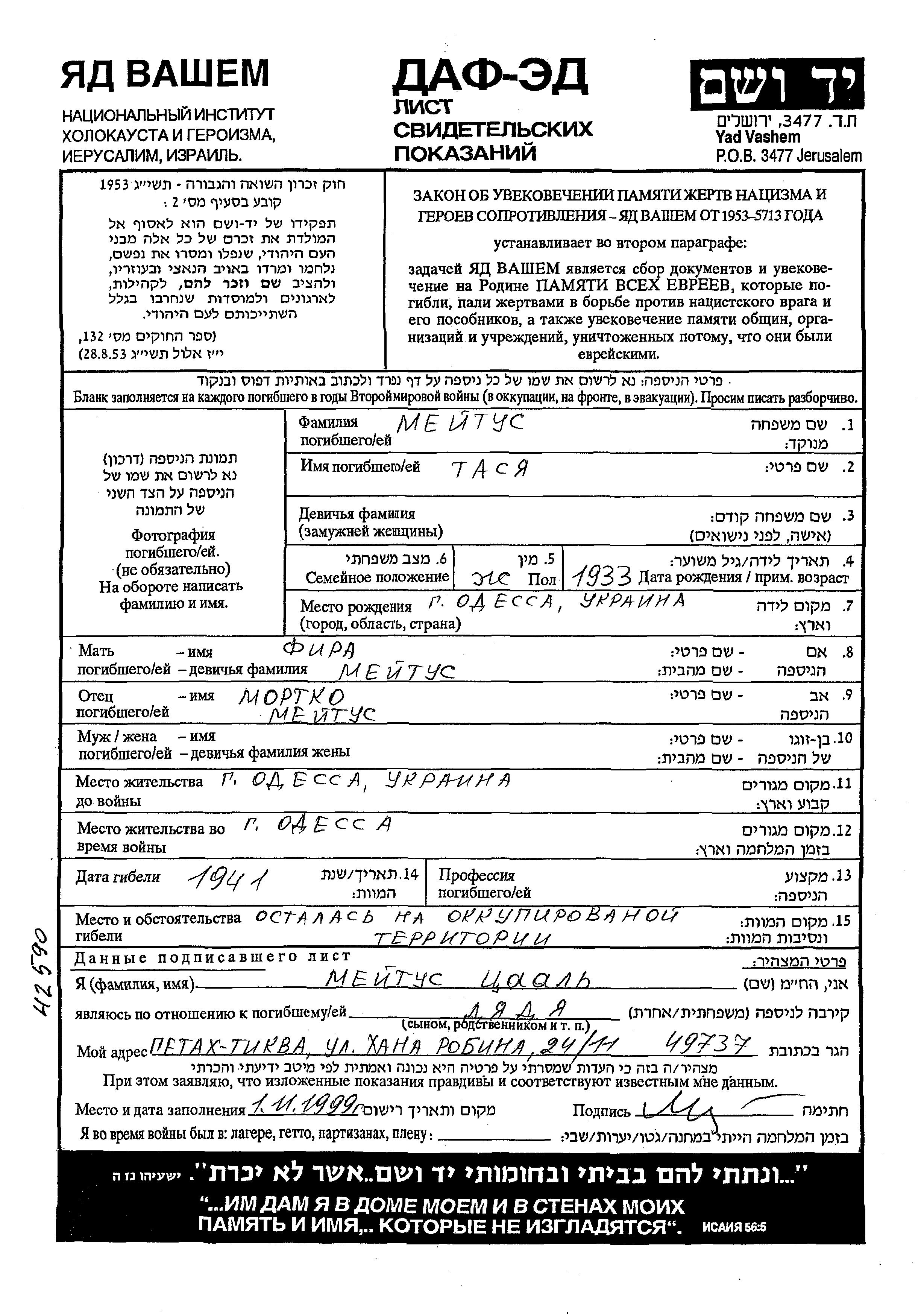 Meitus Tasya 1933 Odessa, Ukraine (URSS) Feuille de témoignage